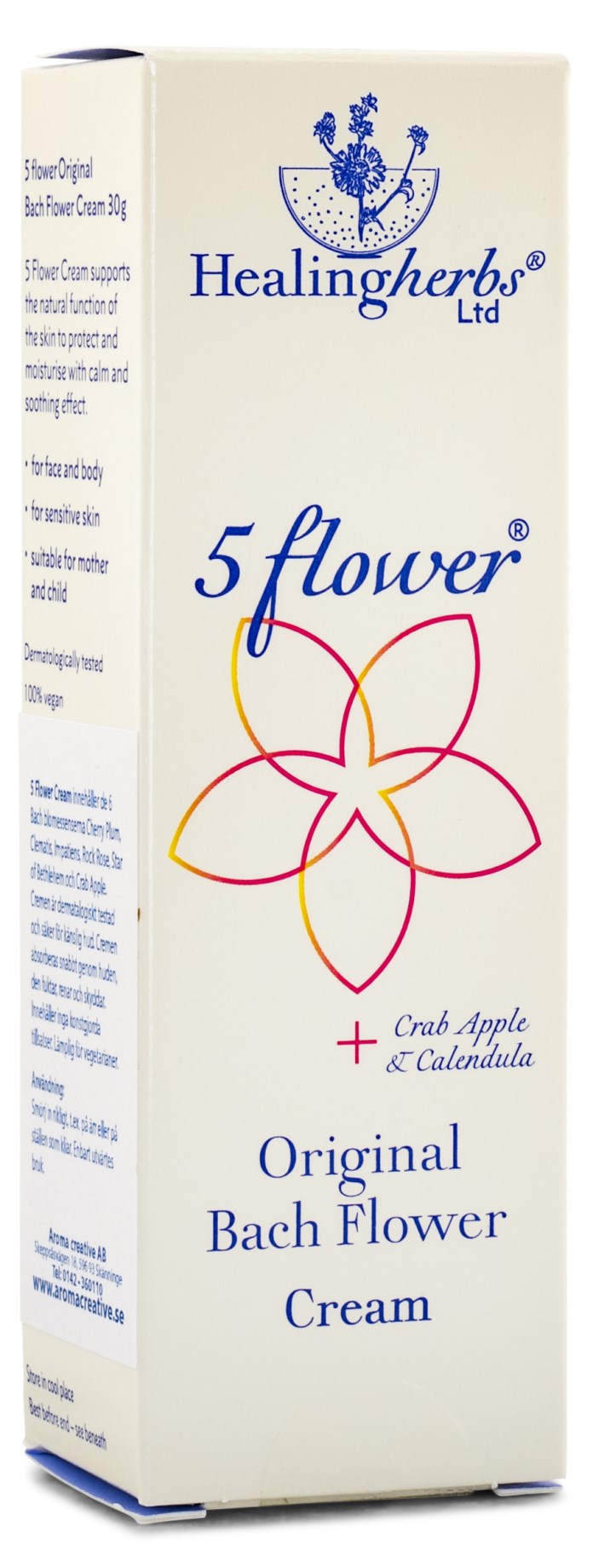 5 flower Cream är en renande universalkräm mot brännsår, klåda och andra fysiska hudproblem. Du kan använda den på insektsbett, hudirritation och den hjälper även att läka ärr. Perfekt även på vintern att smörja på torra läppar och munsår. Krämen innehåller sex av de 38 Bach blomessenserna.