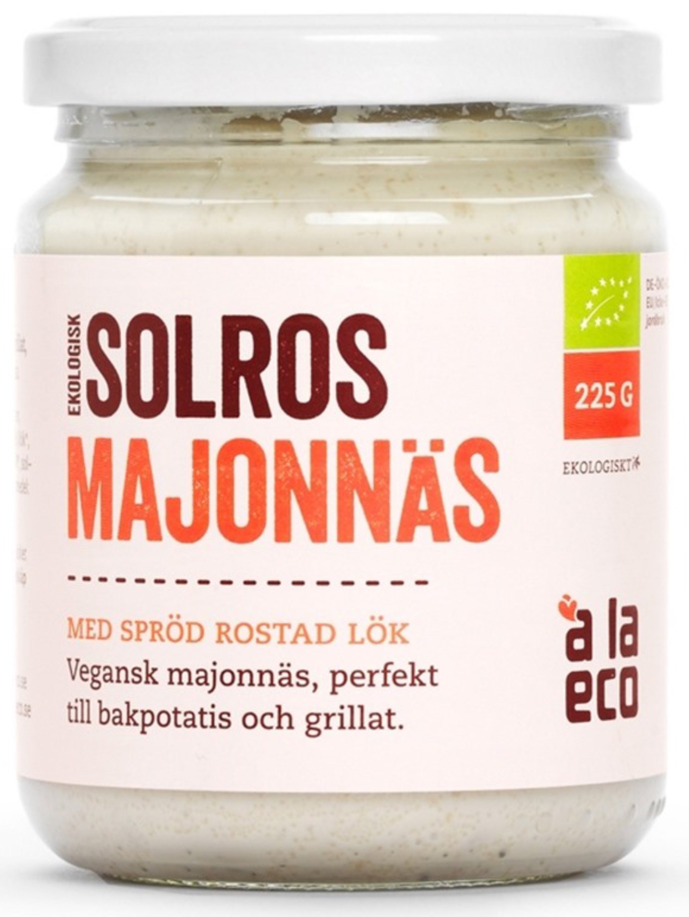Á la ecos Solrosmajonnäs Vegan är en ljuvligt god majonnäs tillverkad av 100 % växtbaserade råvaror. I innehållet finns bland annat solrosolja, solrosprotein och senap. Majonnäsen har en len konsistens med ett innehåll av krispiga lökbitar som ger en extra smakdimension. Ha den till en god sallad, ugnsrostade grönsaker eller som tillbehör till fisken.