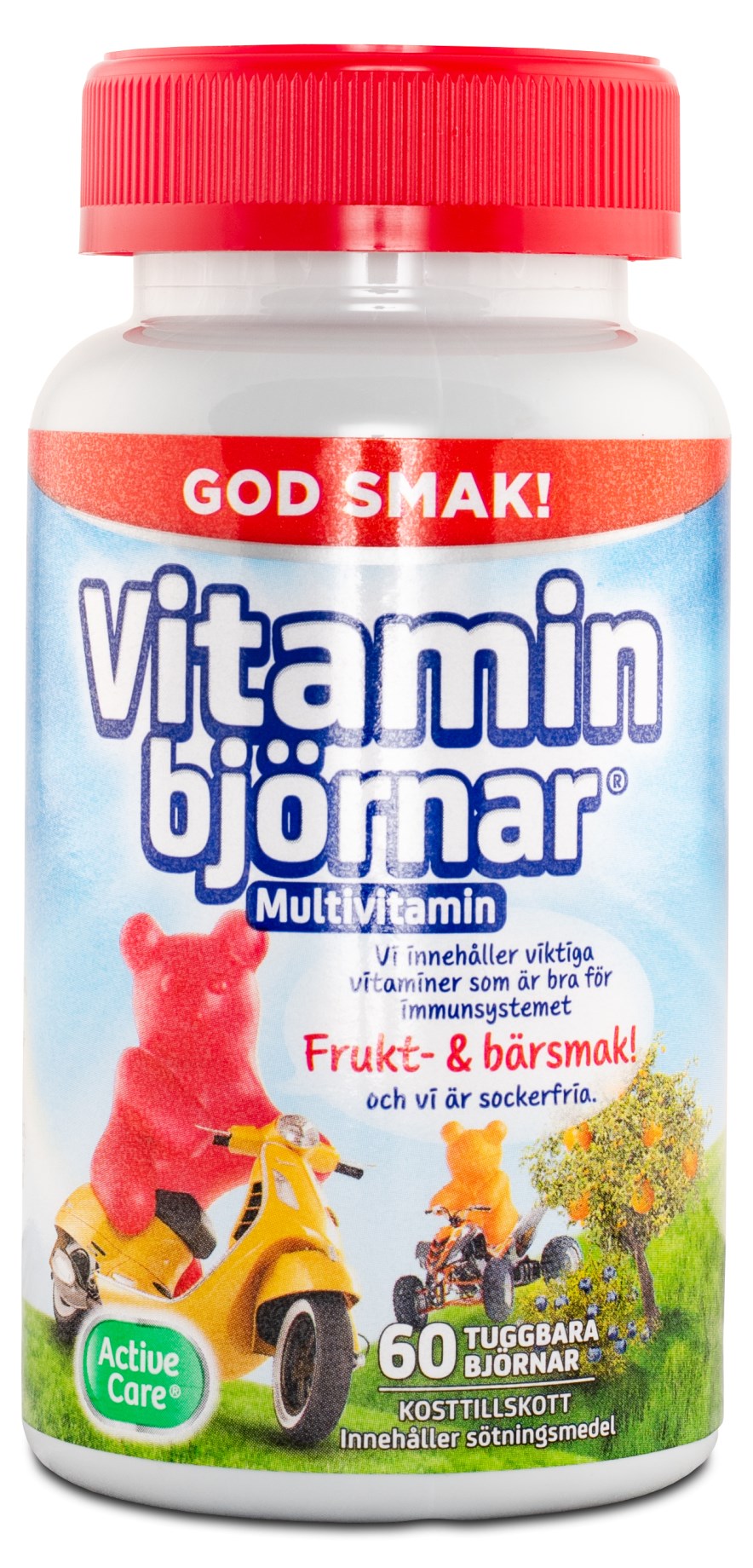 Vitaminbjörnar från Active Care är ett välsmakande och bra sätt att komplettera din dagliga kost. Vitaminbjörnarna smakar fantastiskt gott vilket gör att man enkelt kommer ihåg att ta dem. Björnarna innehåller alla de vitaminer som kroppen behöver och är helt fria från socker.
