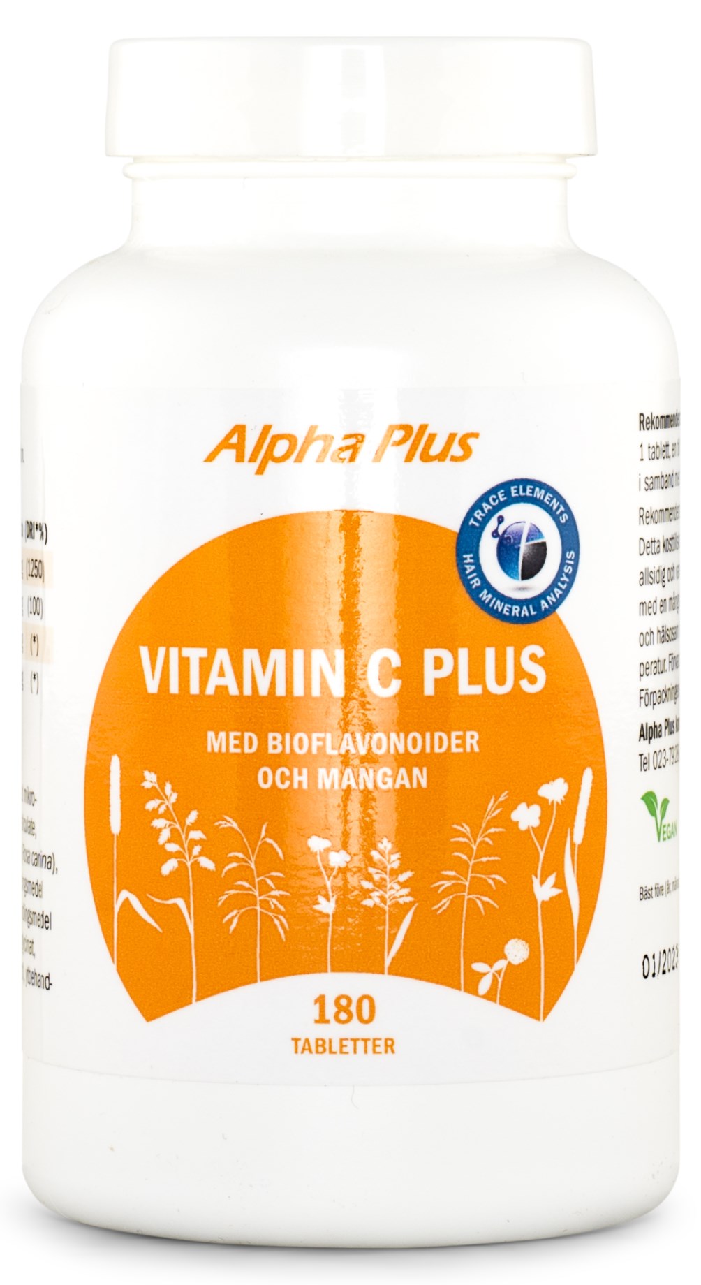 Alpha Plus HMA Vitamin C Plus är ett kombinerat tillskott med C-vitmain, bioflvonoider från nypon och manganbisglycinat. C-vitamin har flera positiva egenskaper och bidrar bland annat till immunsystemets normala funktion, normal kollagenbildning och nervsystemets normala funktion. Alpha Plus HMA Vitamin C Plus är utvecklad av Trace Elements, Inc. i USA. Den används i samband med näringsbalansering enligt rekommendation efter en hårmineralanalys.