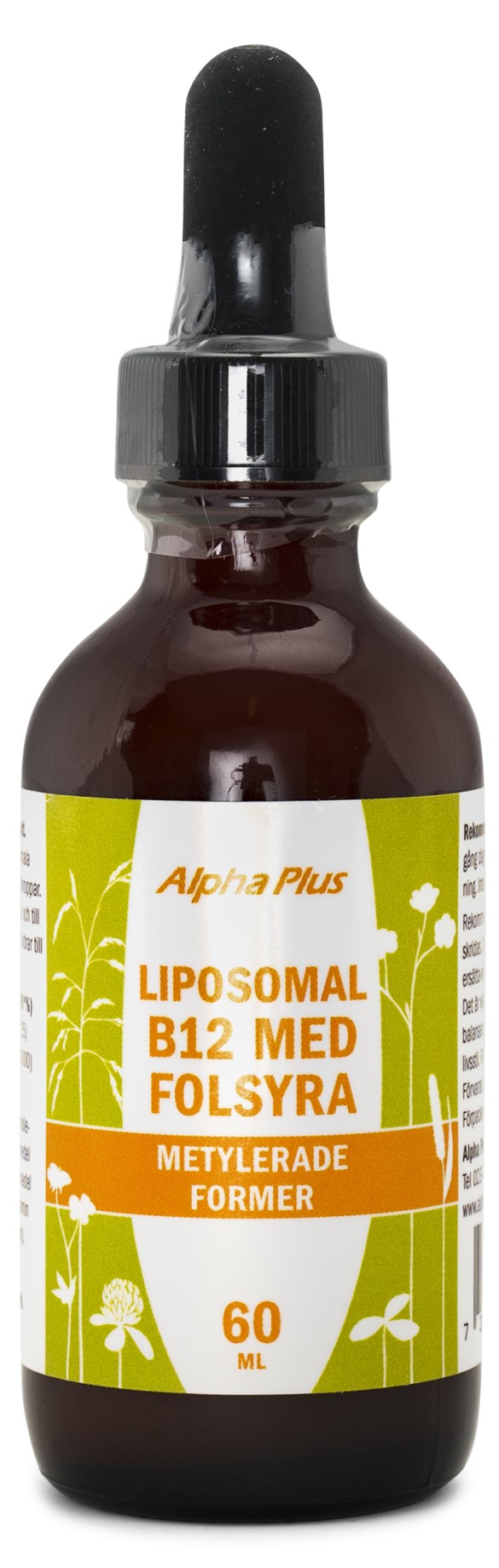 Alpha Plus Liposomal B12 är ett flytande vitamintillskott och innehåller fosfolipid-omslutet B12-vitamin och folsyra i aktiva former. Vitamin B12, även kallat kobalamin, är ett vitamin som tillsammans med folsyra är viktig för bland annat bildandet av röda blodkroppar, cellernas ämnesomsättning och för nervsystemets normala funktion. Liposomala näringsämnen kan tas upp lättare av kroppen och kan även transporteras genom tarmväggen utan att brytas ned. Tillskottet kan dessutom enkelt blandas ut med exempelvis vatten eller juice.
