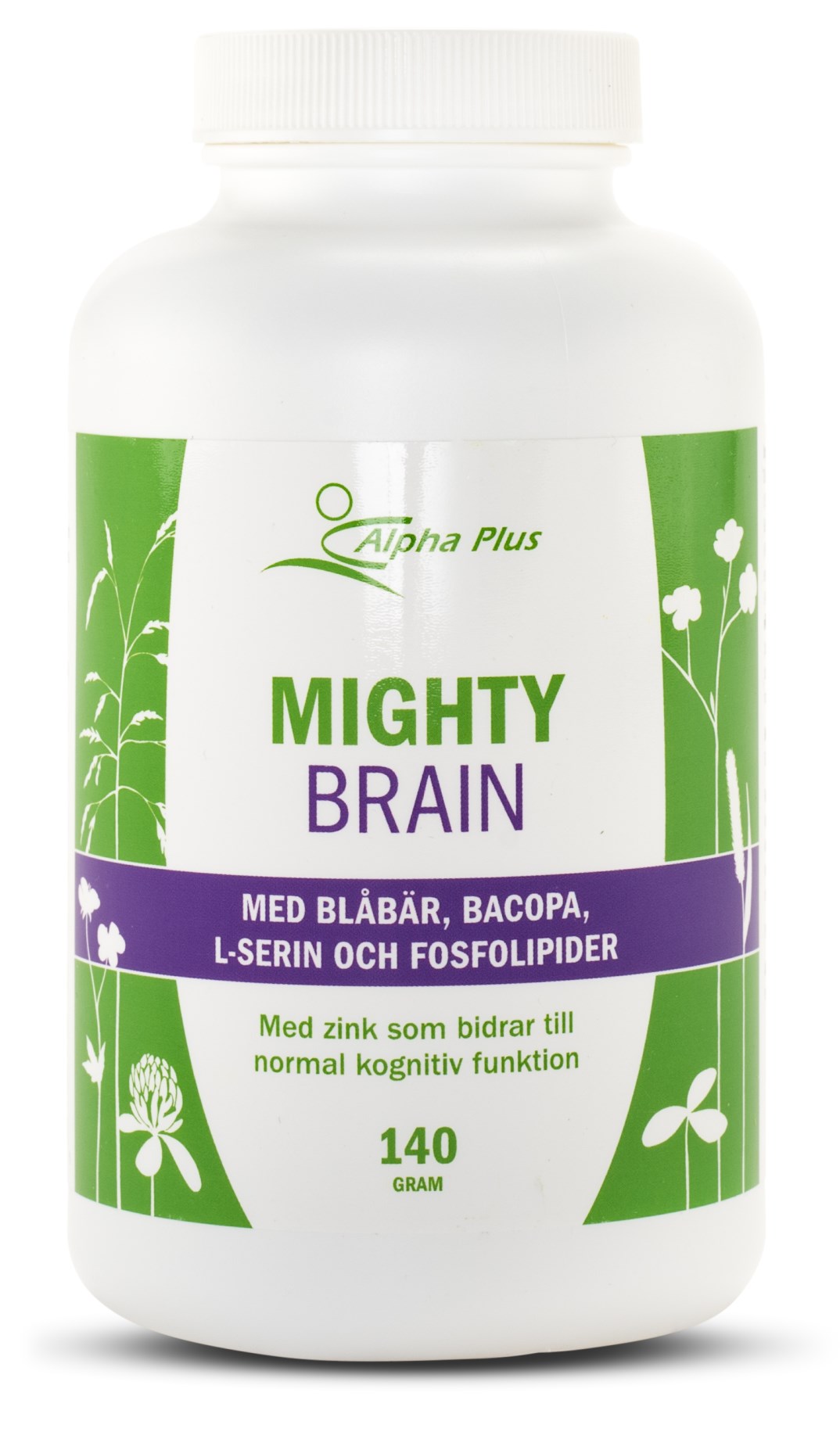 Alpha Plus Mighty Brain är ett högkvalitativt kosttillskott i pulverform som innehåller blåbär, bacopa, fettsyror i form av fosfolipider samt zink. Zink är ett livsnödvändigt mineral som bidrar till immunförsvarets normala funktion samt en fungerande ämnesomsättning. Blåbär är intressant ur flera hälsoperspektiv då den innehåller både vitaminer och mineraler och dessutom är mycket rik på antioxidanter. Alpha Plus Mighty Brain är även berikad med extrakt av rosenrot och vitamin B12. Rosenrot hör till de adaptogena växterna och bidrar till mer energifylld vardag.