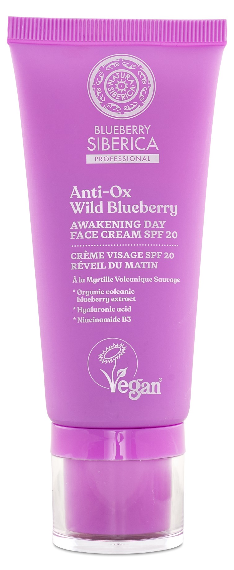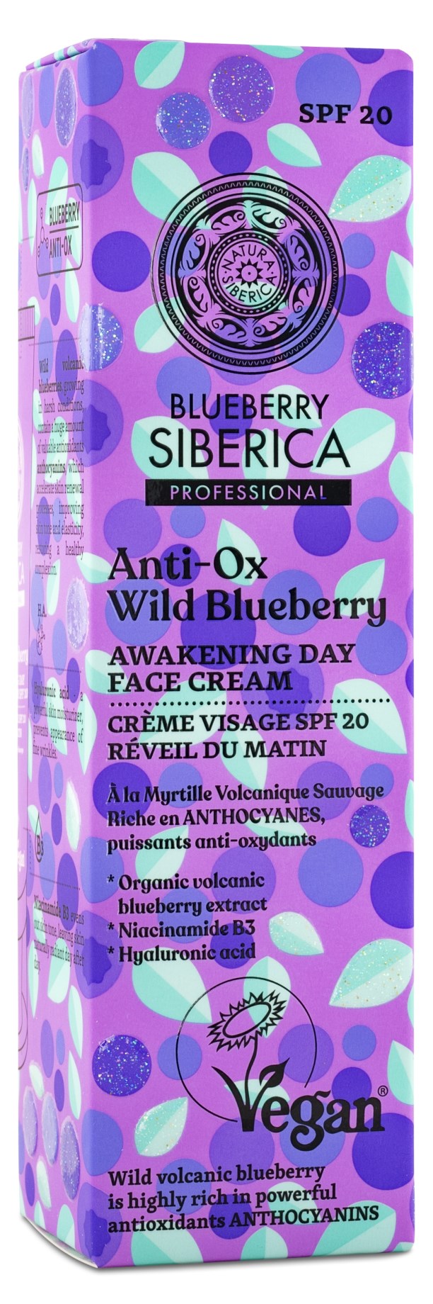 Anti-OX Wild Blueberry Awakening Day Face Cream från Natura Siberica är en dagkräm som är speciellt framtagen för att bekämpa storstadslivets påfrestningar för huden. Krämen har en vegansk formula av ekologiskt extrakt från antioxidantrika blåbär, fuktbindande hyaluronsyra och vitamin B3. Den skyddar huden, återfuktar på djupet och ger ett vackert glow. Solskyddsfaktor 20.