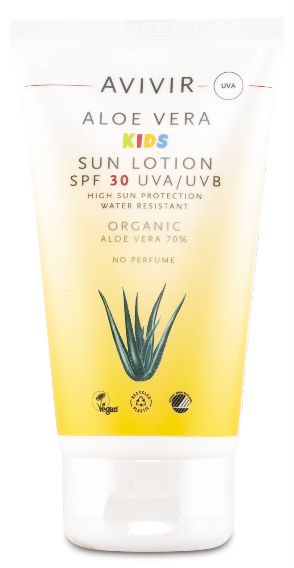 Avivir Aloe Vera Kids Sun Safe 30 är en oparfymerad och vattenfast sollotion med hög skyddsfaktor, speciellt för barn. Solskyddet innehåller vårdande oljor och Bio Active Aloe vera som har en återuppbyggande effekt på huden och stärker dess egna försvar. Den innehåller även vitamin E som verkar återfuktande och mjukgörande på huden.