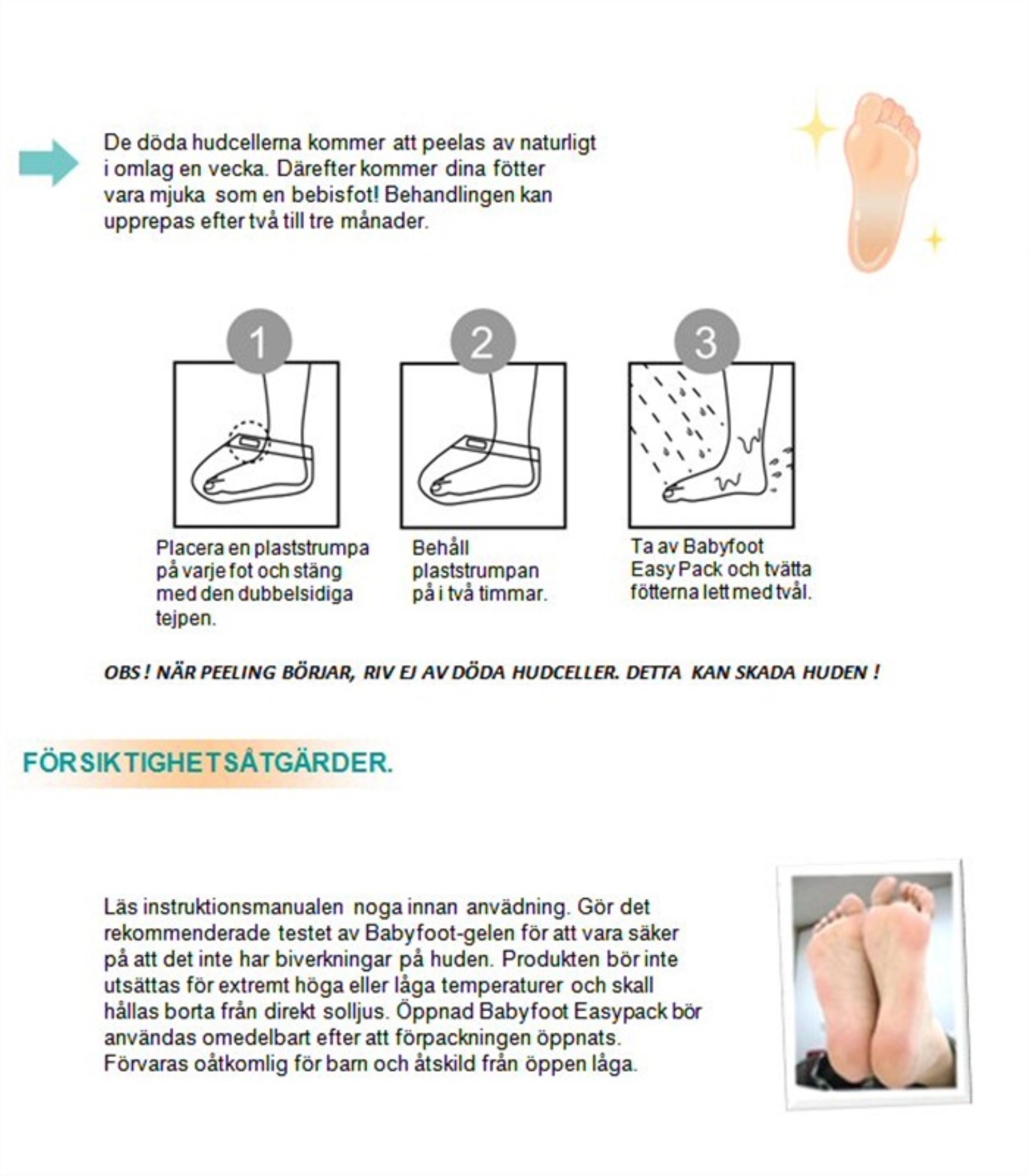 Baby Foots fotkur innehåller naturlig fruktsyra som hjälper till att avlägsna döda hudceller och ge en mjuk fotsula. Fruktsyran tränger in i lagret av döda hudceller och hjälper till att avlägsna den döda huden. Friktionen som uppstår när vi rör oss hjälper sedan till att peela bort den döda huden och fötterna känns mjuka och lena.