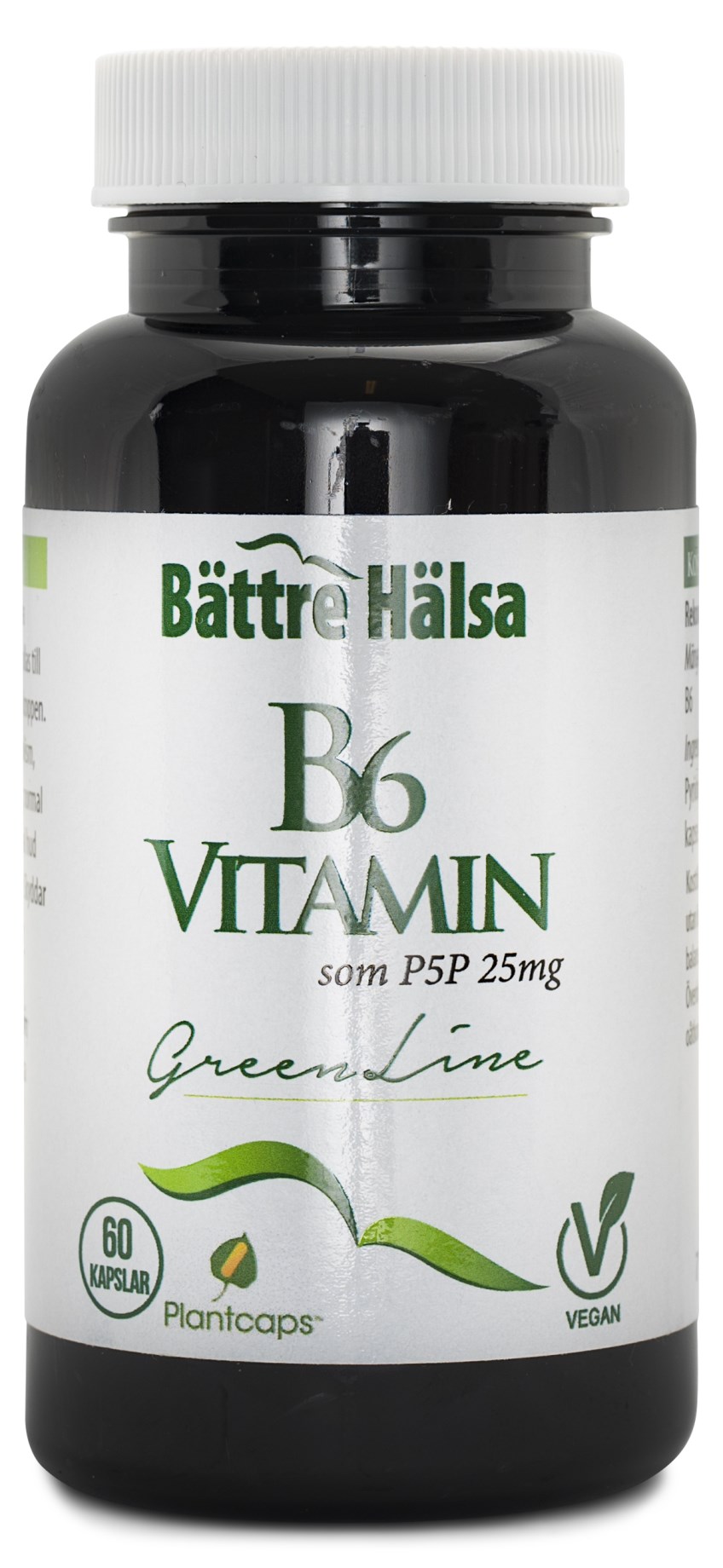 Bättre Hälsa B6 P5P Green Line är ett kosttillskott med en särskilt biotillgänglig och lättupptaglig form av det vattenlösliga vitaminet pyridoxin. Detta vitamin spelar en viktig roll i omsättningen av protein och glykogen och bidrar dessutom till ett normalt fungerande immunsystem och till normal bildning av röda blodkroppar. I Bättre Hälsa B6 P5P Green Line kommer vitamin B6 i den aktiva formen P5P, vilket innebär att den redan är i en form som kroppen kan tillgodogöra sig. Detta skiljer sig från exempelvis pyridoxin hydroklorid och pyridoxal, eftersom dessa typer av B6 behöver brytas ned i levern innan kroppen kan använda dem. Dessutom är Bättre Hälsa B6 P5P en del av företagets Green Line, det vill säga produkter utan onödiga tillsatser och med naturlig kapsel tillverkad av tapiokastärkelse.