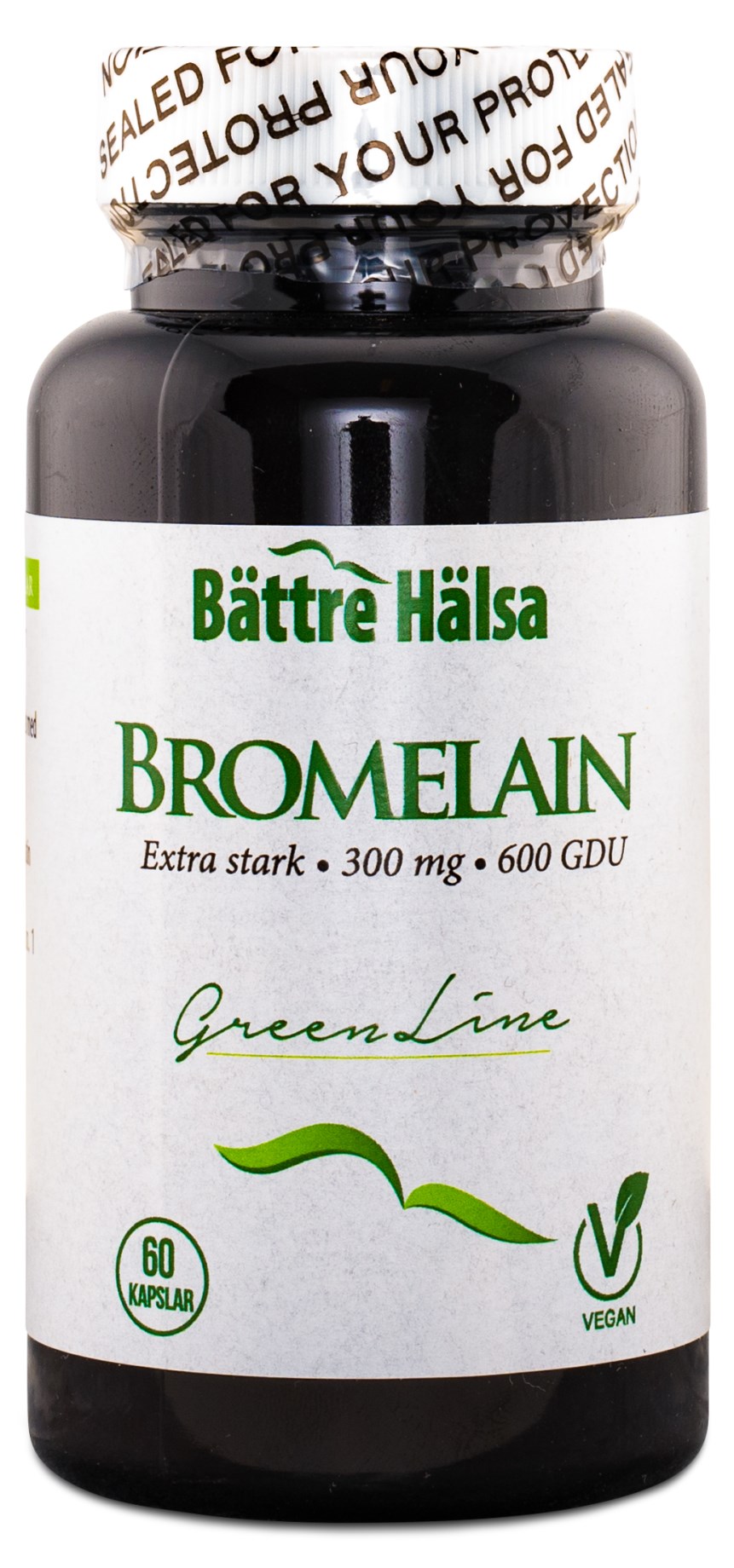 Bättre Hälsa Bromelain Green Line är ett extra starkt enzymtillskott för magen. Bromelain är ett enzym som hjälper till att bryta ner proteiner från kosten vid matsmältningen till mag- tarmkanalen. I Bromelain Green Line från Bättre Hälsa ingår ett extra starkt bromelainenzym från ananasstammen. En kapsel innehåller 300 mg bromelain, motsvarande 600 GDU eller 900 MCU. GDU är ett mått på hur ett gram bromelain kan smälta ner gelatinprotein. MCU är ett mått på hur snabbt bromelain smälter mjölkproteiner. Bromelainets totalstyrka mäts i 2400 GDU, och 3600 MCU.
