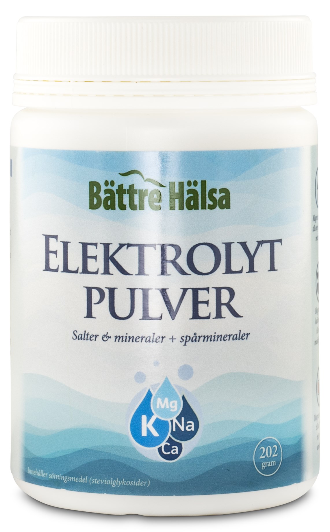Bättre Hälsa Elektrolytpulver innehåller 1000 mg kalium per dos som tillsammans med andra mineraler stödjer vätskebalansen i kroppen. Kalium är bland annat bra för energinivån. Fungerar bra att använda vid mycket träning och svettning men även för dig som behöver extra mineraler till din kost. Går enkelt att blanda i ett glas vatten.