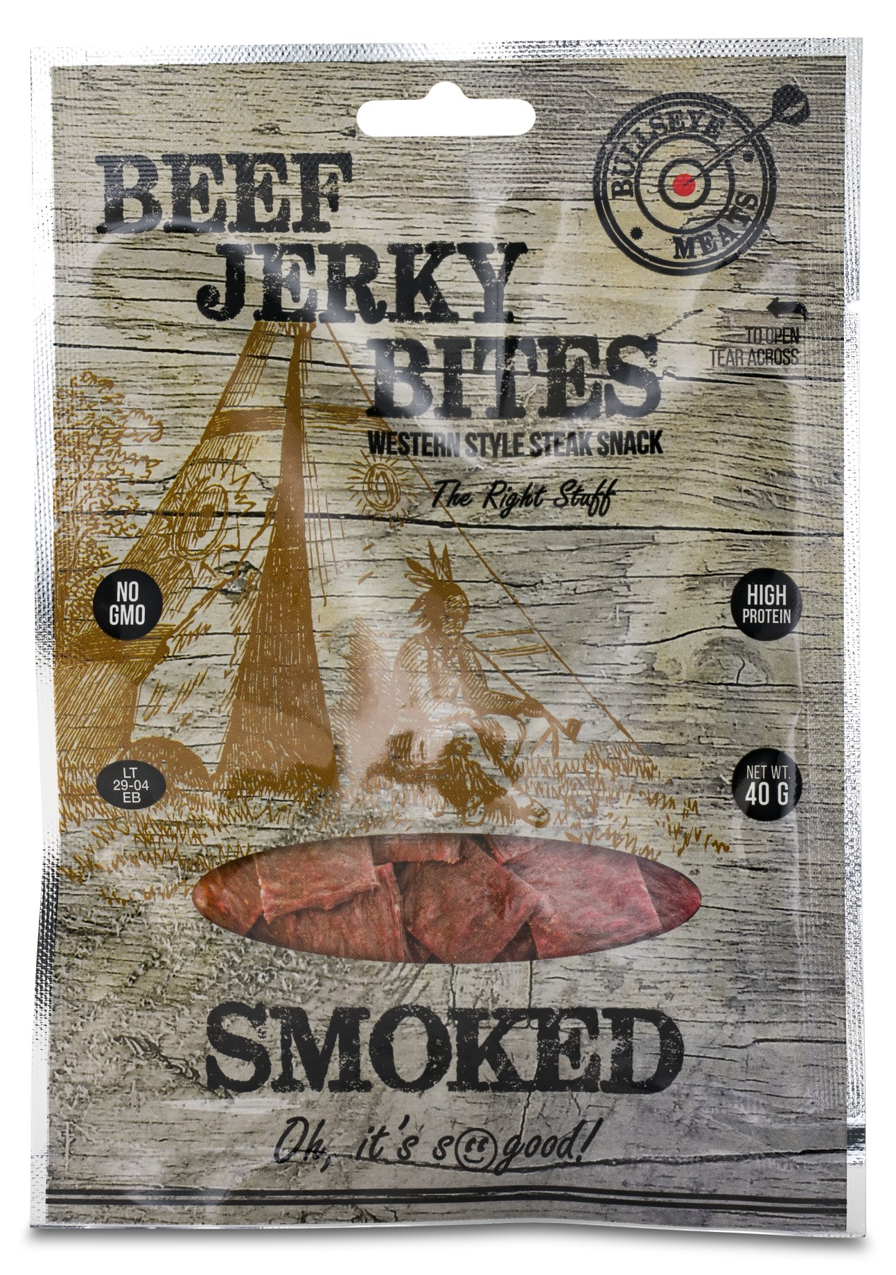 Beef Jerky Bites Smoked är ett proteinrikt och ett kalorisnålt snacks som passar perfekt att ta med på utflykten, som mellanmål, eller varför inte som tilltugg till öl eller vin? Bitarna består av torkat nötkött med lite mjukare tuggmotstånd jämfört med traditionell beef jerky, och har en mild smak av rökig biff. Beef Jerky Bites Smoked har lång hållbarhet och kan förvaras i rumstemperatur.