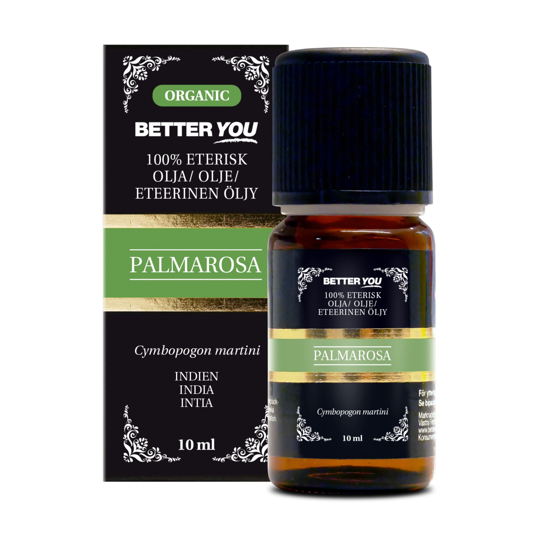 Upptäck Better You Eterisk Olja Palmarosa – en olja med blommig, söt och rosaktig doft. Palmarosa är mångsidig och populär att använda i parfym och hudvård. Inom hudvård kan oljan hjälpa till att balansera hudens naturliga oljeproduktion, tillföra fukt och stärka hudens barriär. Perfekt för alla hudtyper! Palmarosa används även inom aromaterapi där den har en stärkande effekt på sinnet samtidigt som den skapar en avslappnad atmosfär. Populär vid stressreducering och för att minska nervositet och oro.