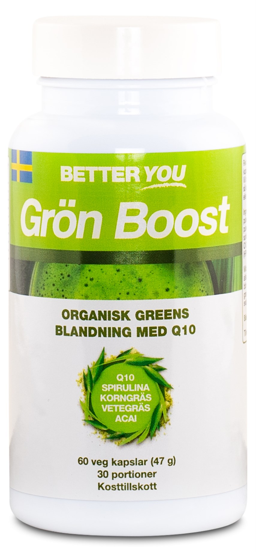 Alla vet att grönsaker är bra för oss, och ju starkare färg en grönsak eller frukt har, desto mer näring och fler antioxidanter innehåller den i regel. Emellanåt kan det dock vara svårt att upprätthålla en hälsosam livsstil med mycket frukt och grönt, och då kan det underlätta med bra vanor i övrigt. Grön Boost Kapslar är ett dagligt näringstillskott för både dig som alltid äter näringsrikt och vill toppa med extra greens, och för dig som ibland behöver en extra skjuts. Grön Boost Kapslar är baserad på greenspulver från algerna spirulina och chlorella, vetegräs, alfaalfa, surkörsbär, acaibär och grönt te med mera. Dessutom innehåller den en hög halt Q10.