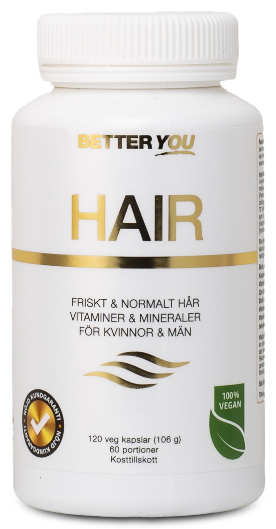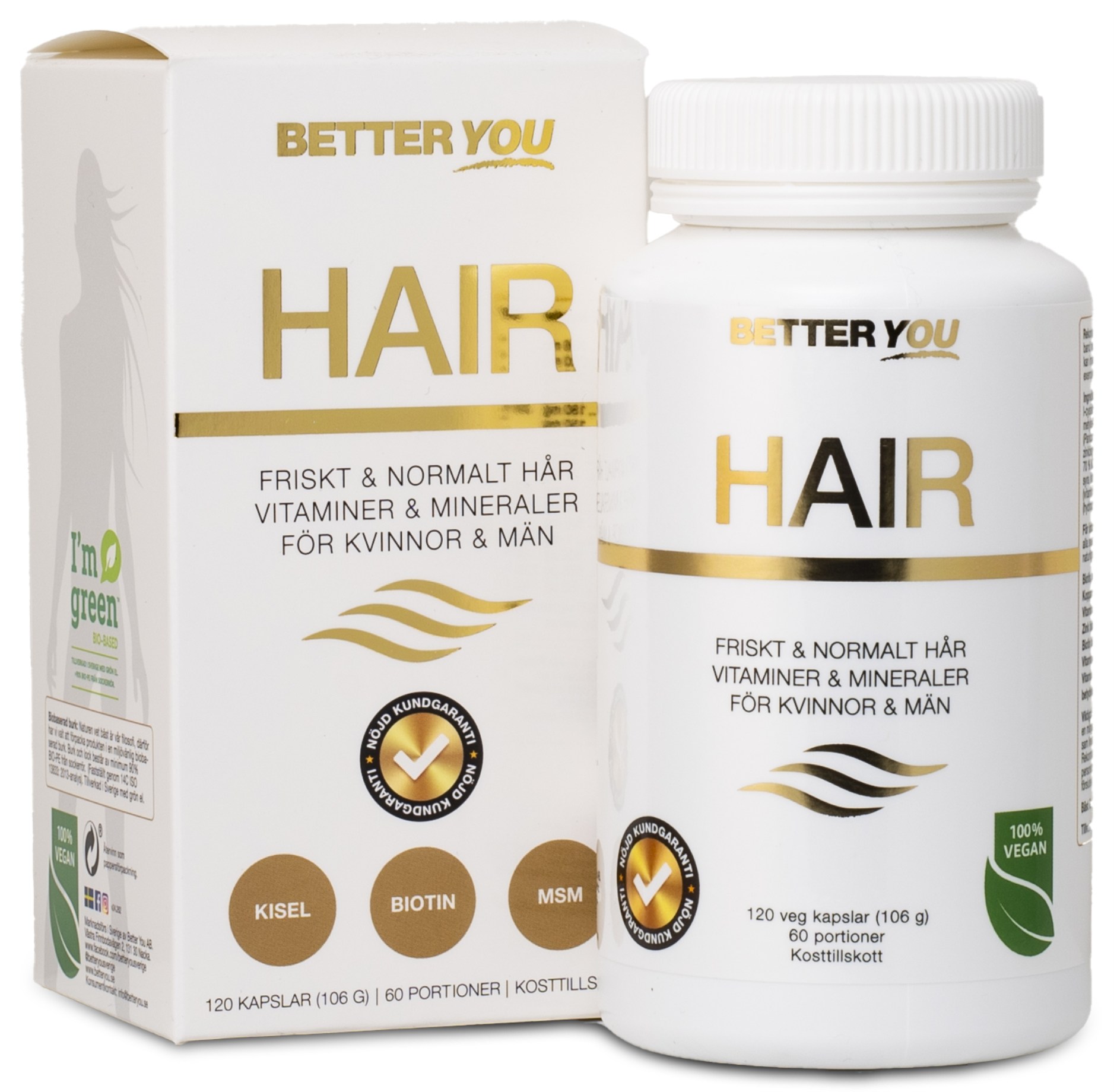 Better You HAIR är ett exklusivt kosttillskott som hjälper håret att hålla sig friskt och starkt. Tillskottet innehåller utvalda vitaminer, mineraler och aminosyror som på olika sätt bidrar till normalt hår och hårbotten. Tillskottet innehåller bland annat biotin, zink och selen som bidrar till att bibehålla normalt hår, samt koppar som bidrar till hårets normala pigmentering. Det innehåller även naturligt svavel i form av MSM samt aminosyran L-cystein som båda är naturliga beståndsdelar i håret. Dessutom innehåller Better You HAIR helnäringsextrakt från bambu som är naturligt rikt på kisel. Kisel bidrar till bildandet av kollagen, som är en viktig byggsten i hår, hud och naglar.