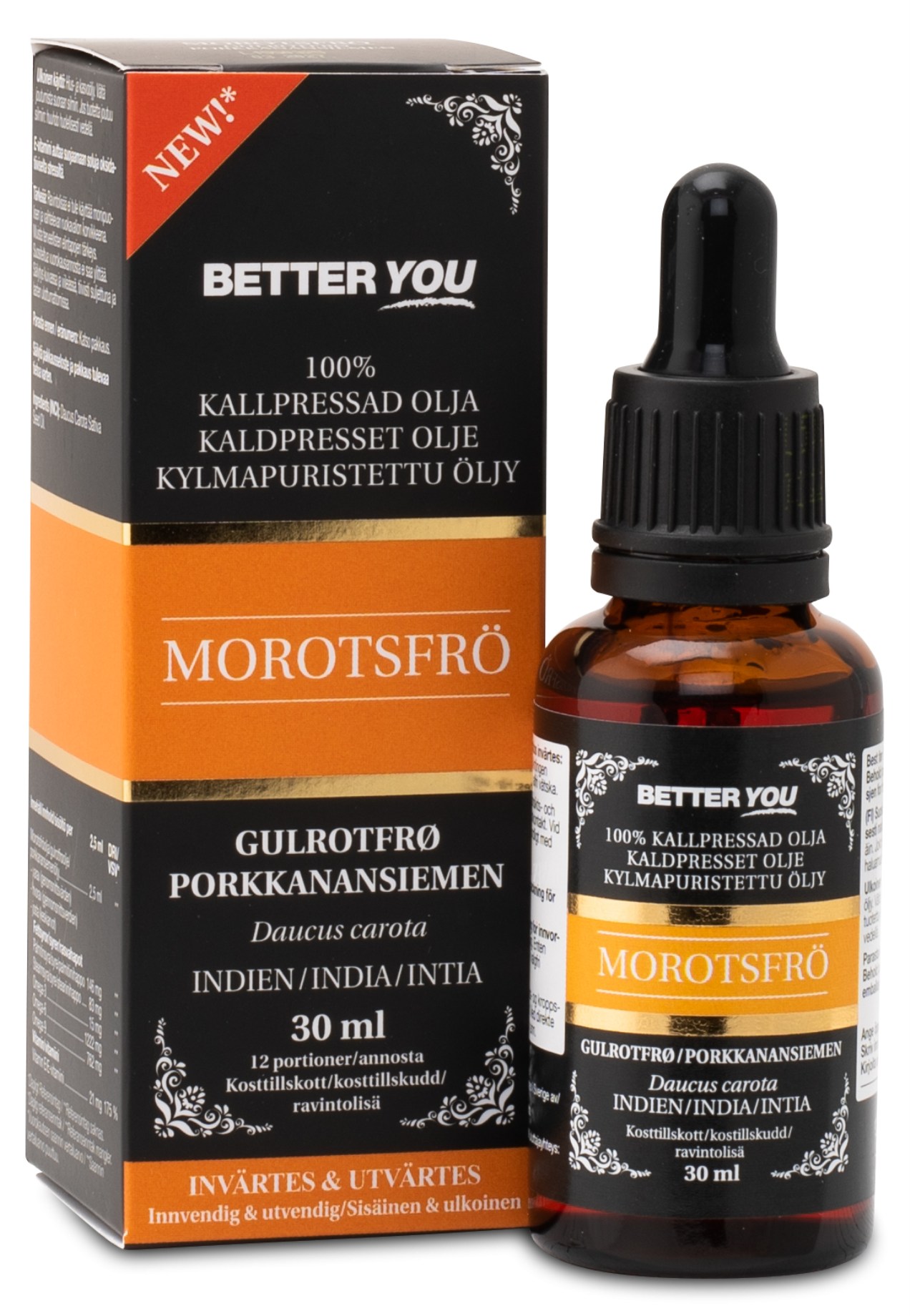 Letar du efter en exklusiv och kallpressad morotsfröolja? Då är det Better You Morotsfröolja Kallpressad oljan du söker efter! I oljan finner du antioxidanter samt A- och E-vitamin, vilket gör den väldigt näringsrik. Dess rena och koncentrerade form gör den dessutom unik då den är helt outspädd. Better You Morotsfröolja Kallpressad kan bland annat användas till hår- samt hudvård och passar då alla hudtyper. Du kan även använda den för invärtes bruk.