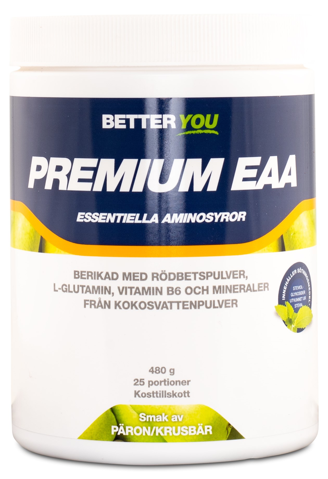 Better You Premium EAA är ett populärt tillskott av grenade aminosyror och med en extra hög halt av L-leucin. Tillskott av aminosyror i fri form är populärt hos personer som tränar hårt då de inte bara bidrar till att bibehålla muskelmassan, utan kan även fungera som extra bränsle och tillföra ny energi vid tunga träningspass. Better You Premium EAA är förstärkt med mineraler från kokosvattenpulver och rödbetspulver. Kokosvatten är rikt på både kalium och elektrolyter som båda bidrar till att motverka uttorkning vid längre pass. Rödbetor är kända för att vara rika på nitrater och innehåller dessutom A-, B- och C- vitaminer och mineraler som exempelvis zink och magnesium. Better You Premium EAA finns i flera härliga smaker.