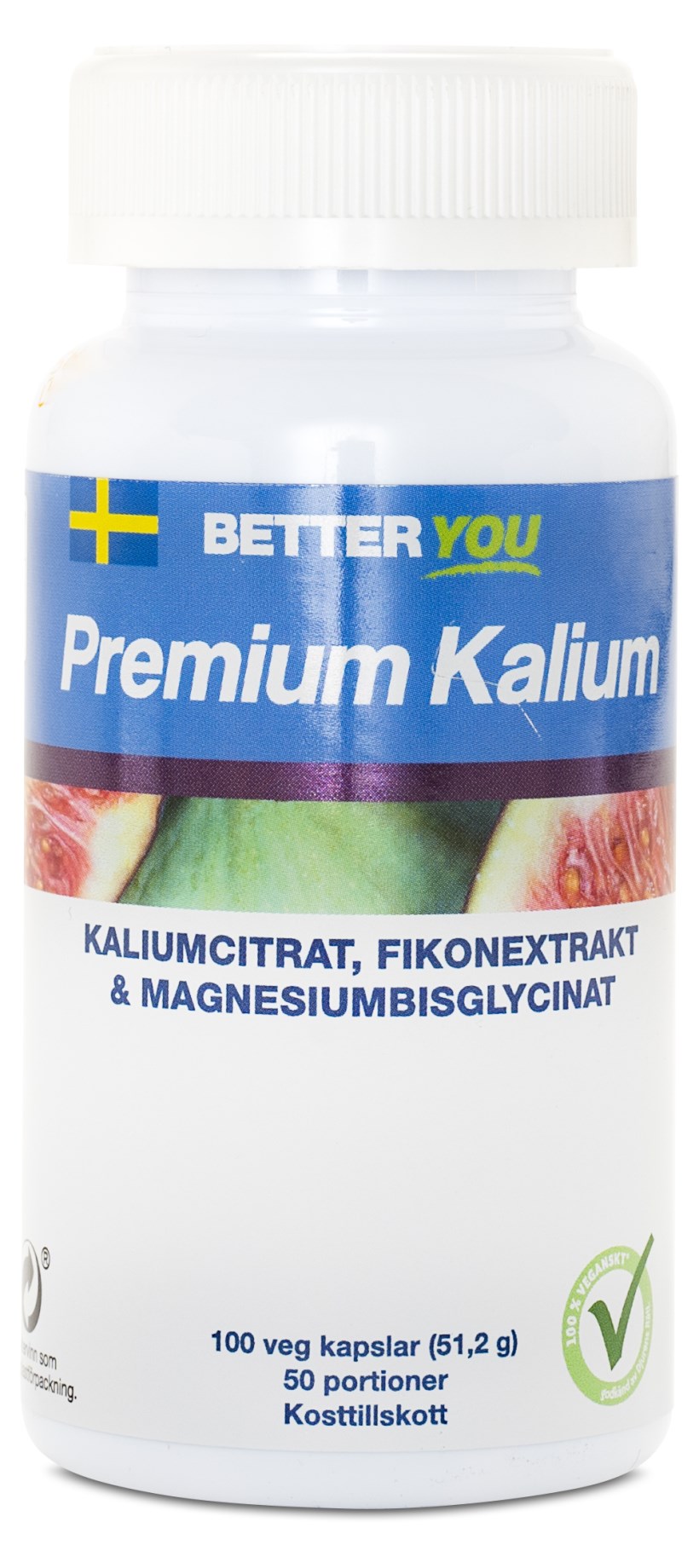 Premium Kalium är ett kaliumtillskott i kapselform från Better You. Kalium är ett mineral vars uppgift i kroppen är att reglera blodtrycket samt att bidra till en normal muskel- och nervfunktion. Better You Premium Kalium innehåller fikon som är naturligt rikt på kalium men även magnesium som förbättrar flödet av kalium till cellen. Kalium räknas som ett grundämne som återfinns i de allra flesta livsmedel och som vi måste få i oss. I kosten finns kalium i relativt höga halter i exempelvis potatis, frukt, kött och grönsaker.