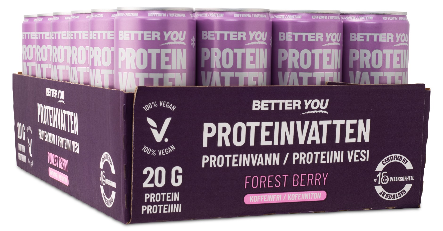 Better You Proteinvatten är ett smaksatt kolsyrat vatten med tillsatta fria aminosyror. Proteinvattnet innehåller hela 20 gram essentiella aminosyror per portion, vilka visat sig positiva kroppens proteinsyntes och är ett populärt tillskott vid träning. Drycken innehåller endast naturliga ingredienser och är helt fri från socker och andra tillsatsämnen. Dessutom finns Better You Proteinvatten både med och utan koffein, så du kan avnjuta den goda drycken när som helst på dygnet.