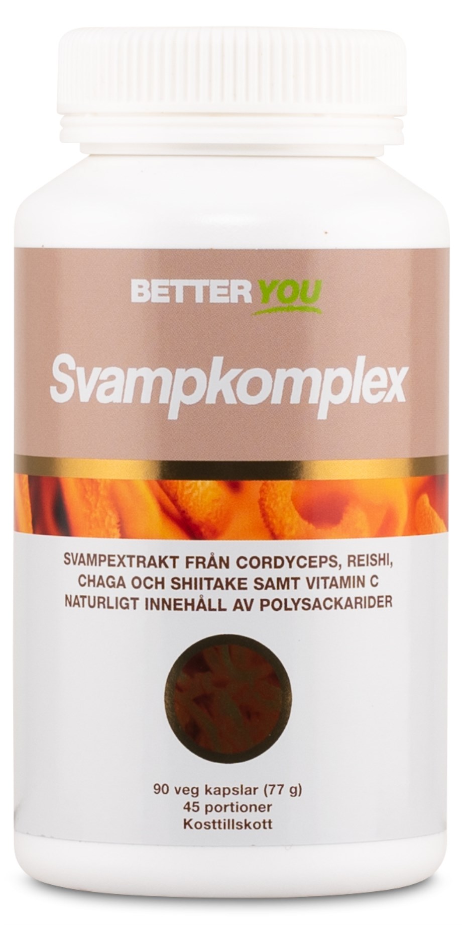 Better You Svampkomplex är ett komplex bestående av svamparna cordyceps, reishi, chaga och shiitake, fyra populära svampar som är välkända inom naturmedel. Komplexet innehåller även C-vitamin som bidrar till immunsystemets normala funktion. Svamparna är naturliga adaptogener och har ett högt ORAC-värde, vilket är ett värde för hur mycket antioxidanter ett livsmedel innehåller. Adaptogener är växter som innehåller ämnen som hjälper kroppen att anpassa sig till utmanande förhållanden och motverka skador orsakade av dessa påfrestningar.