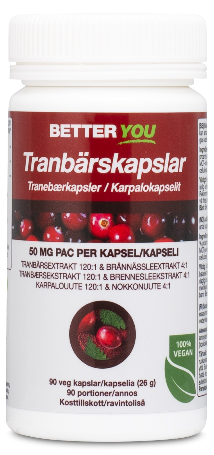 Tranbärskapslarna från Better You innehåller 100 % naturligt tranbärsextrakt. Produkten är dessutom helt vegetabilisk. Tranbär innehåller proanthocyanidin, PAC, som förutom ger bäret dess röda färg även har antioxidativa effekter. Tranbär är även rikt på vitamin C som bidrar till ett normalt fungerande immunsystem. Better You Tranbärskapslar är dessutom kompletterade med brännässlaextrakt.