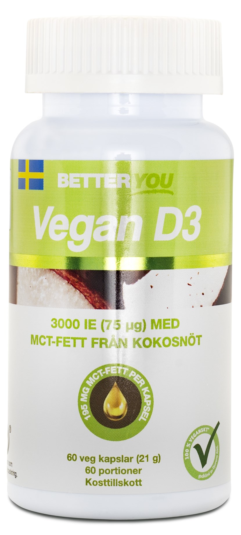 Better You Vegan D3 3000 IE + MCT-fett är det veganska alternativet för dig som vill ha ett tillskott av D-vitamin. D-vitamin spelar en stor roll för bland annat normal benstomme, normal muskelfunktion, normala kalciumnivåer samt immunsystemets normala funktion. Eftersom D-vitamin är fettlösligt främjas upptaget av vitaminet om du kombinerar det med en liten mängd fett. Därför har Better You Vegan D3 tillsatt MCT-olja från kokosnöt. D-vitaminet i Better You Vegan D3 3000 IE + MCT-fett kommer från lav och hela kapseln och dess innehåll är helt veganskt.