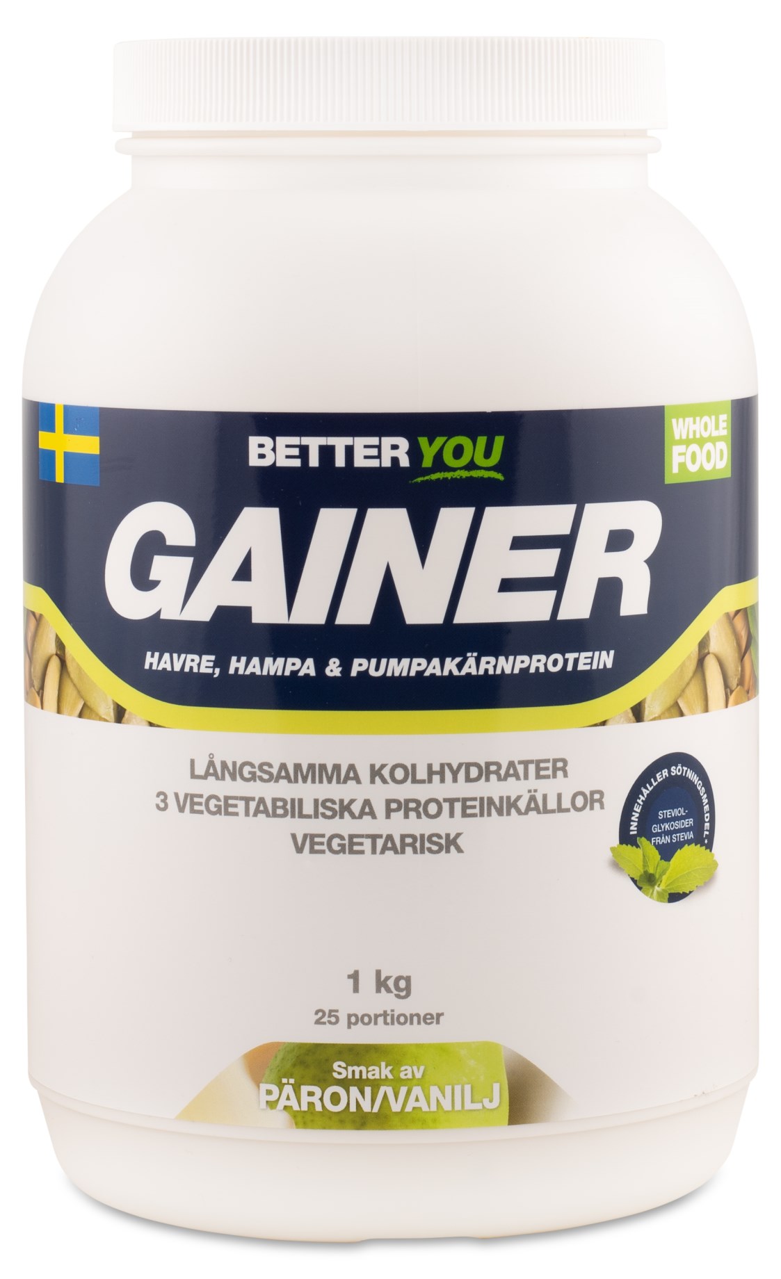 Efterfrågan på vegetabiliska produkter ökar stadigt och denna vegetabiliska gainer är ett svar på detta. Better You har utvecklat en välsmakande gainer med fokus på naturligt och vegetabiliskt innehåll, samtidigt som man lagt krut på effekten. Produkten innehåller proteiner från havre, pumpakärnor och hampa, samt kolhydratskällan palatinos. Använd som energitillskott efter avslutat träningspass, som uppladdning innan träning eller som mellanmål. Vegetarisk Gainer innehåller enbart vegetabiliska ingredienser och är sötad med stevioglycosider, som vi i dagligt tal kallar stevia.