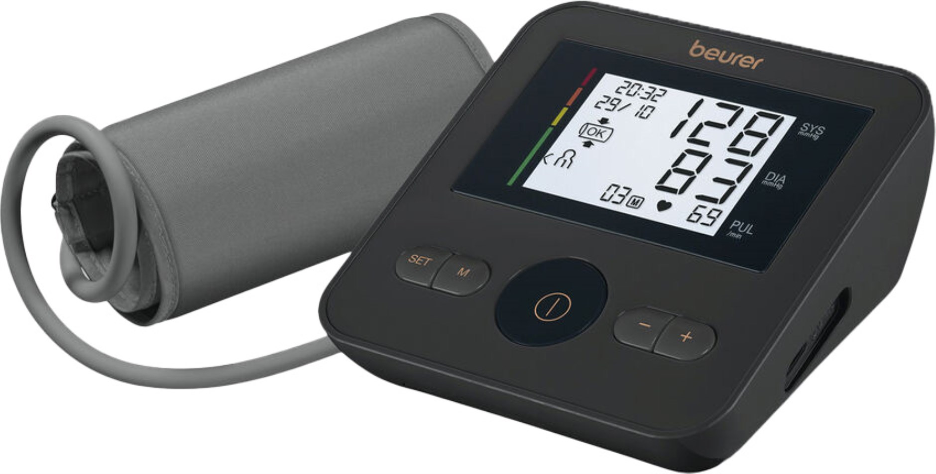 Beurer Blodtrycksmätare BM 27 är en helt automatisk blodtrycksmätare för hemmabruk. Mätaren erbjuder bekväm och snabb mätning med en tydlig display som visar systoliskt och diastoliskt tryck samt puls. Blodtrycksmätare upptäcker arytmi och varnar vid eventuell oregelbunden hjärtrytm, och är kliniskt testad enligt ESH. Blodtrycksmätaren visar även genomsnittligt blodtrycksvärde av samtliga sparade blodtrycksmätningar.