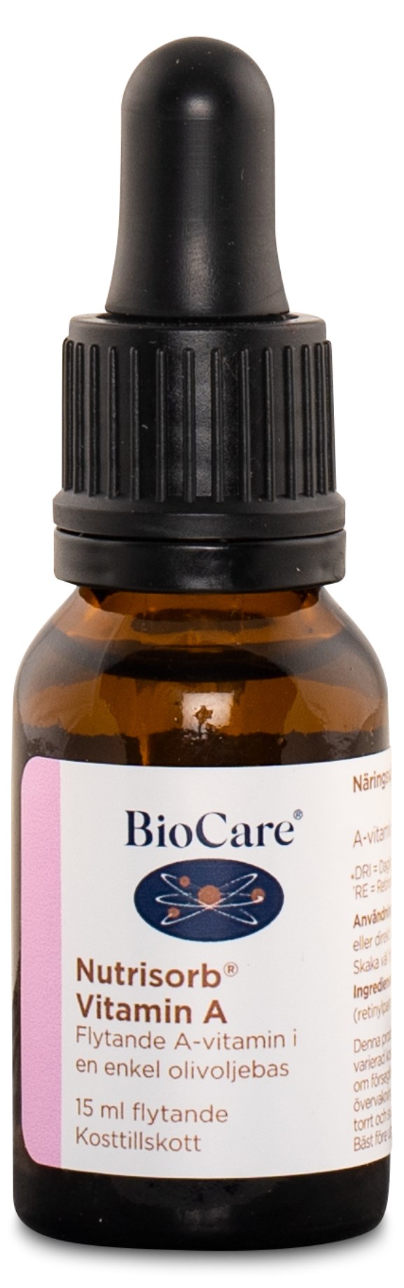 BioCare Nutrisorb A-vitamin är ett flytande A-vitamin för huden, slemhinnorna, synen och immunsystemet. Med hela 2500 IE A-vitamin, som lätt absorberas av kroppen, är det ett kvalitativt tillskott för dig som vill ha det allra bästa! Det fettlösliga vitaminet är i en olivoljebas och tas med fördel i samband med mat, då fettlösliga vitaminer behöver fett för att lösas upp. Blanda tillskottet i en dryck eller ta det direkt under tungan. Ett smidigt och bekvämt alternativ till kapslar och tabletter samt för dig med matsmältningssvårigheter!