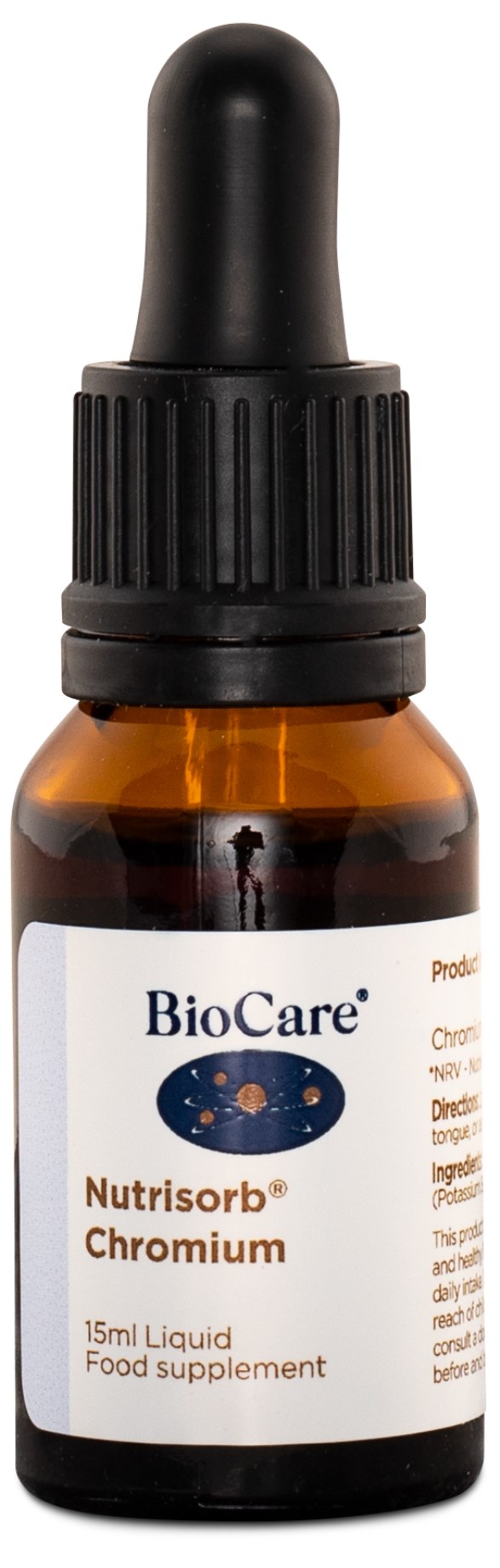 BioCare Nutrisorb Krom är ett tillskott av krom i flytande form, i en enkel och renad vattenbas utan tillsatser. Flytande tillskott är lämpligt för dig som har svårt att svälja tabletter eller helt enkelt föredrar flytande. Tillskottet ger dig 100 ug krom per 2 droppar och blandas enkelt i vätska men kan även tas under tungan. Krom deltar i kroppens omsättning av glukos.