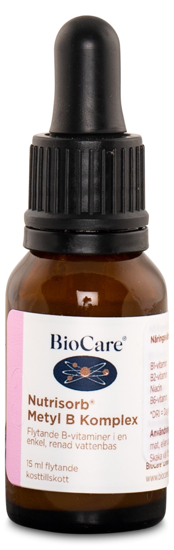 BioCare Nutrisorb Metyl B Komplex är ett kraftfullt B-komplex i en smidig flytande form. Detta tillskott innehåller viktiga B-vitaminer i sina mest naturliga och aktiva former som kroppen lätt kan ta upp. Det innehåller bland annat folat i form av metylfolat, vilket är den form som finns i livsmedel som gröna grönsaker. Det innehåller även vitamin B2, B3, B5, B6 och B12 som bland annat bidrar till att minska trötthet och utmattning. BioCare Nutrisorb Metyl B Komplex har en ren och hypoallergen vattenbas och är lätt att dosera och inta. Tillskottet är veganvänligt.