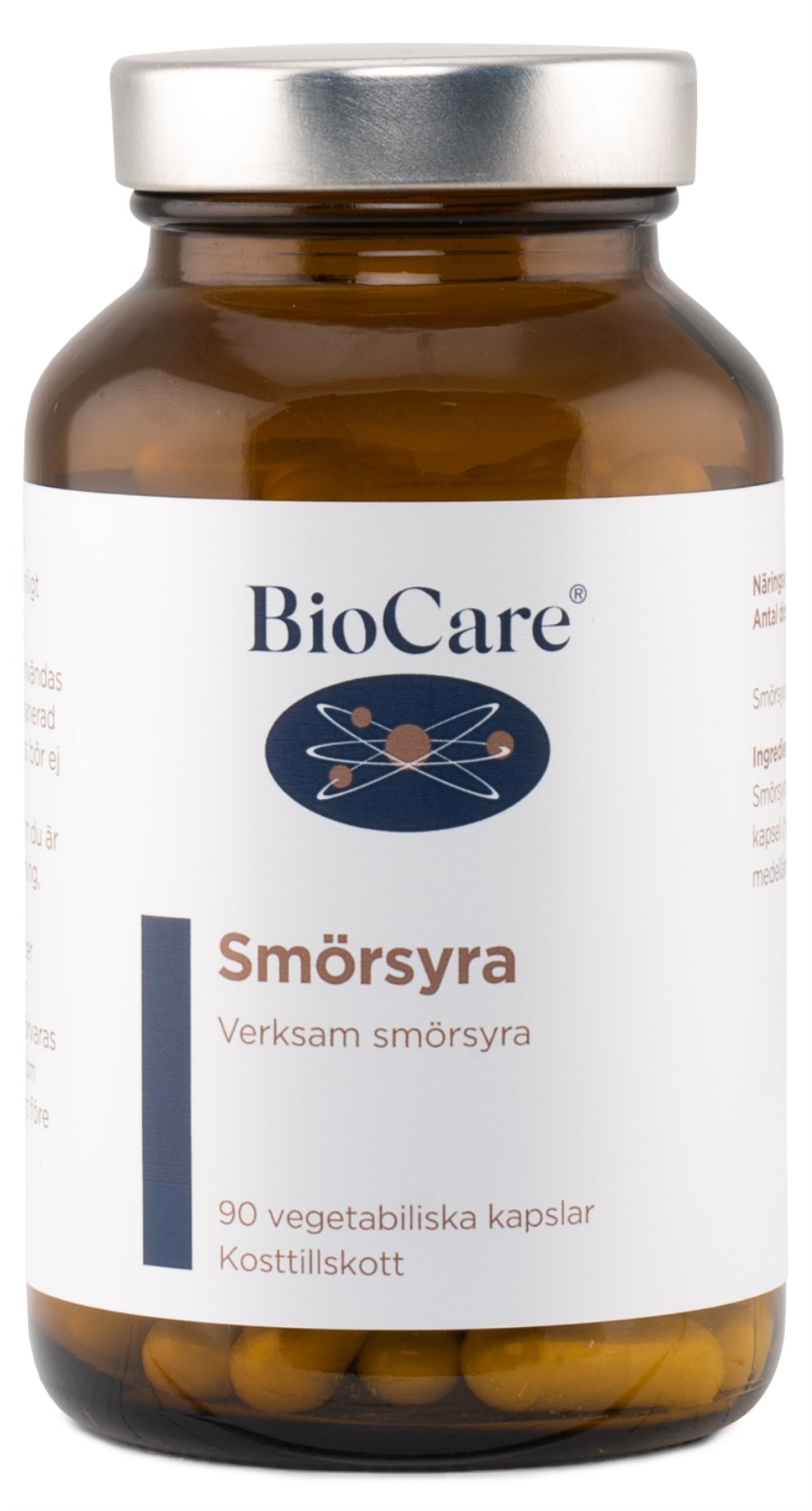 BioCare Smörsyra är ett dagligt tillskott med fettsyran smörsyra. Smörsyra är en kortkedjig fettsyra som produceras när en viss typ av bakterier i tjocktarmen bryter ner kostfibrer. Att ha en hög andel smörsyra i tarmarna anses positivt eftersom smörsyran har antiinflammatoriska egenskaper och dessutom misstänks kunna stärka tarmens barriär. Med en stark barriär släpps mindre skadliga substanser ut genom tarmslemhinnan, vilket också kan minska risken för en irriterad och inflammerad tarm. BioCare Smörsyra riktar sig därför till dig som lider av olika mag- och tarmproblem som uppblåsthet, IBS och svårigheter att bryta ned exempelvis fiberrika livsmedel.