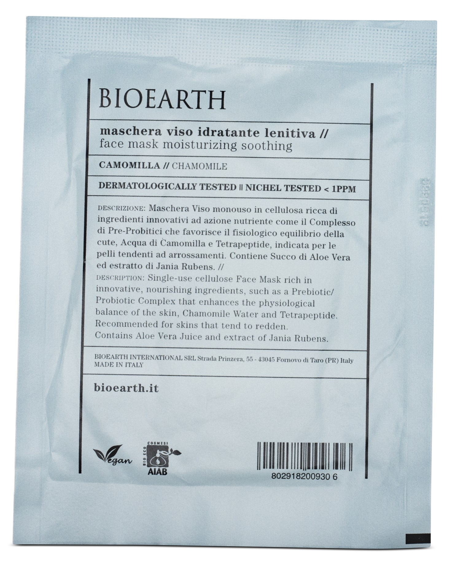 Bioearth Sheetmask Moisturising Soothing är en vegansk och naturlig sheetmask som verkar återfuktande, lugnande och minskar rodnader. Masken innehåller kamomillvatten, prebiotika och tetrapeptider vilket främjar hudens fysiologiska balans. Den är baserad på aloe verajuice och Jania Rubens som är en röd alg rik på aquaporiner, dessa fungerar som vattenkanaler som reglerar vattentillförseln inne i cellerna. Masken är vegansk, nickel- och dermatologiskt testad och AIAB-certifierad. Den passar torr, stressad och känslig hud.