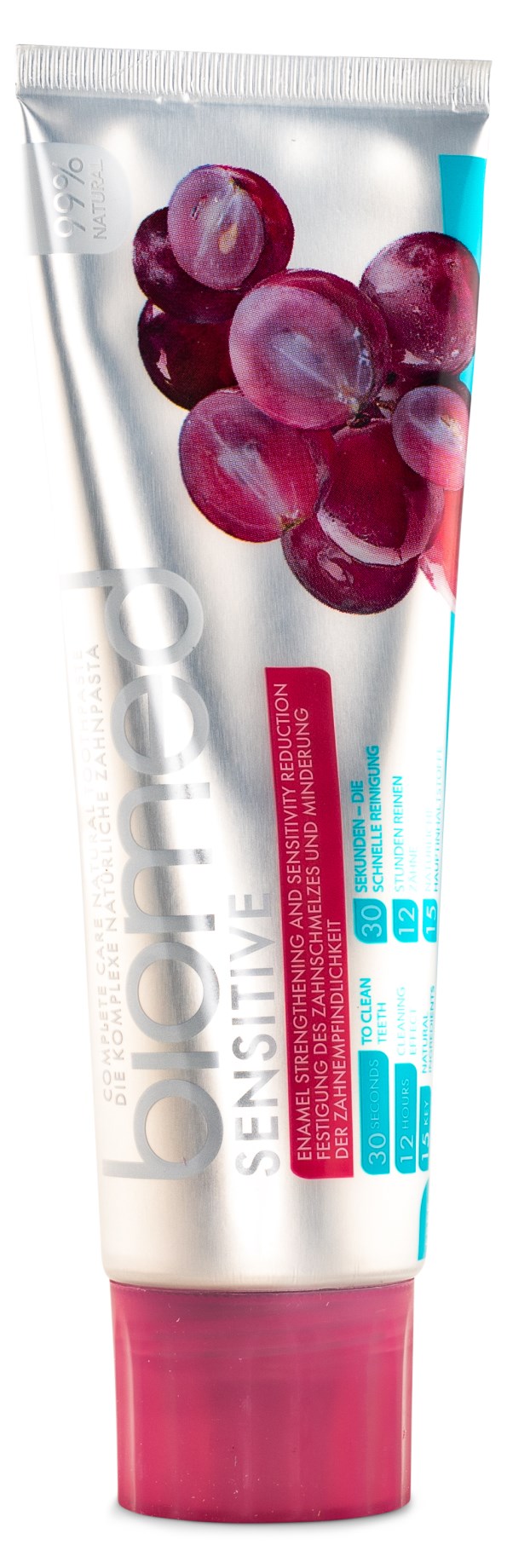 Biomed Tandkräm Sensitive är en vegansk och naturlig tandkräm för dig som har extra känsliga tänder. Tandkrämen rengör skonsamt utan att slita på emaljen. Den innehåller olja från frön av röd druva och hydroxyapatit, ett mineral som hjälper till att bygga upp emaljen. Tandkrämen har en frisk smak som kommer från citrusolja. Med sina naturliga ingredienser är det här en perfekt tandkräm för dig som vill undvika onödiga tillsatser i din tandborstningsrutin.