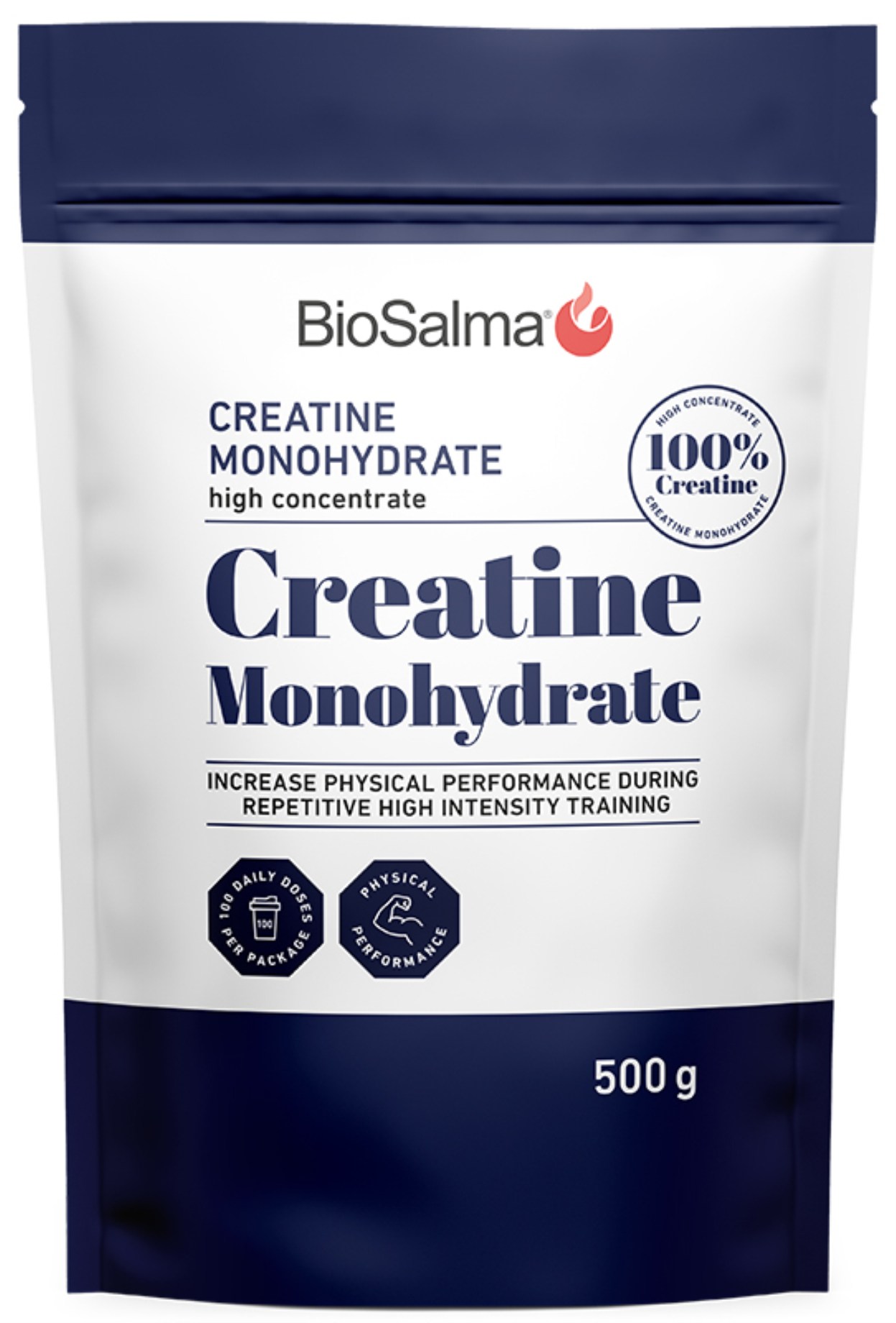 BioSalma Creatine Monohydrate 100% innehåller rent kreatinmonohydrat. Kreatin används för att öka fysisk prestation vid upprepade kraftansträngningar i samband med högintensiv träning. Med 3 g kreatin per dag uppnås den gynnsamma effekten. BioSalma Creatine Monohydrate 100% innehåller inga tillsatser eller utfyllnadsämnen.