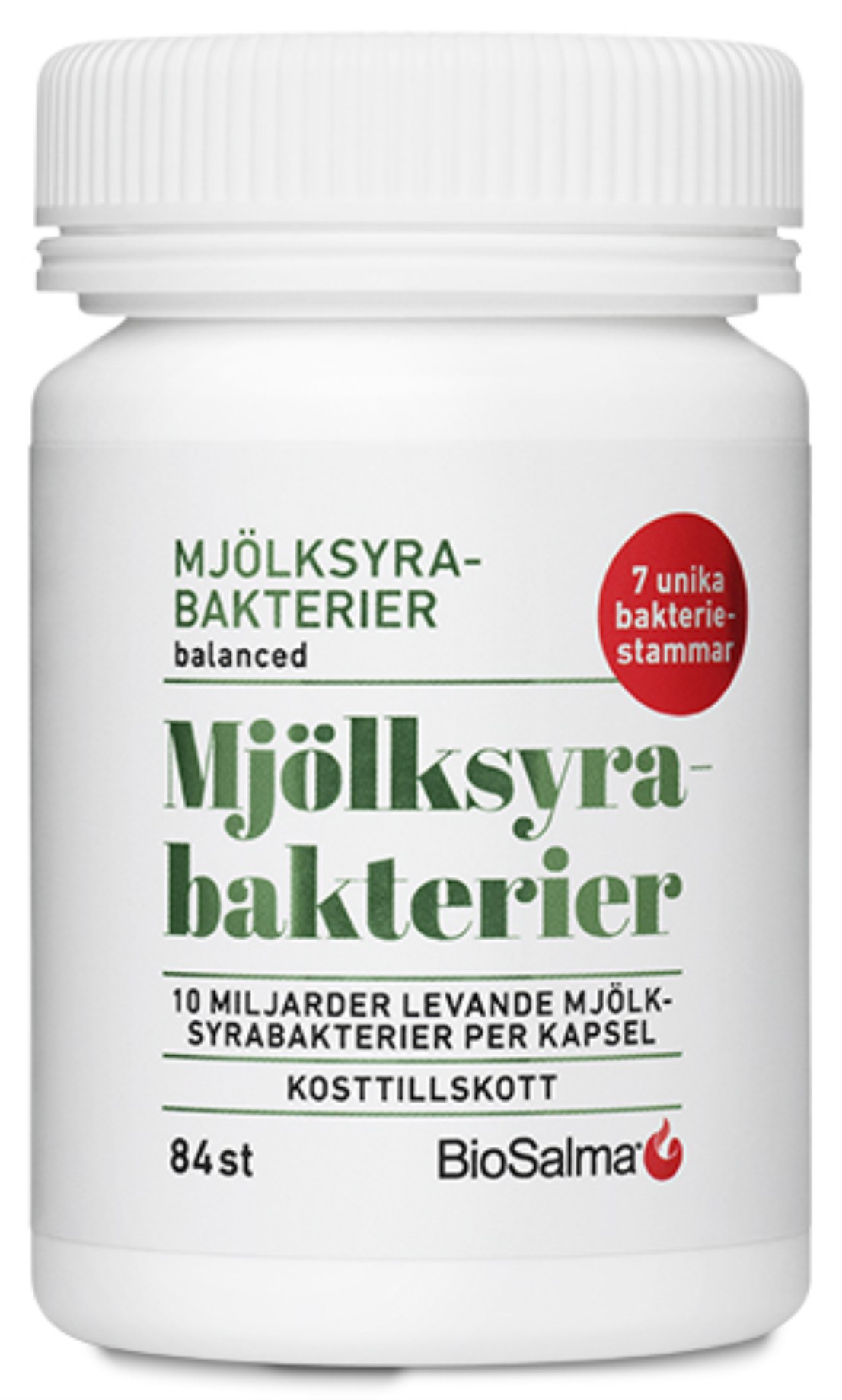 BioSalma Mjölksyrabakterier 7 stammar innehåller 10 miljarder mjölksyrabakterier från sju noggrant utvalda stammar i varje kapsel. Mjölksyrabakterier är mikroorganismer som finns naturligt i kroppen samt i yoghurt, kimchi, surkål och andra fermenterade livsmedel. Skalet på kapslarna är magsyraresistent, vilket gör att mjölksyrabakterierna kan passera magsäcken utan påverkan från magsyran.