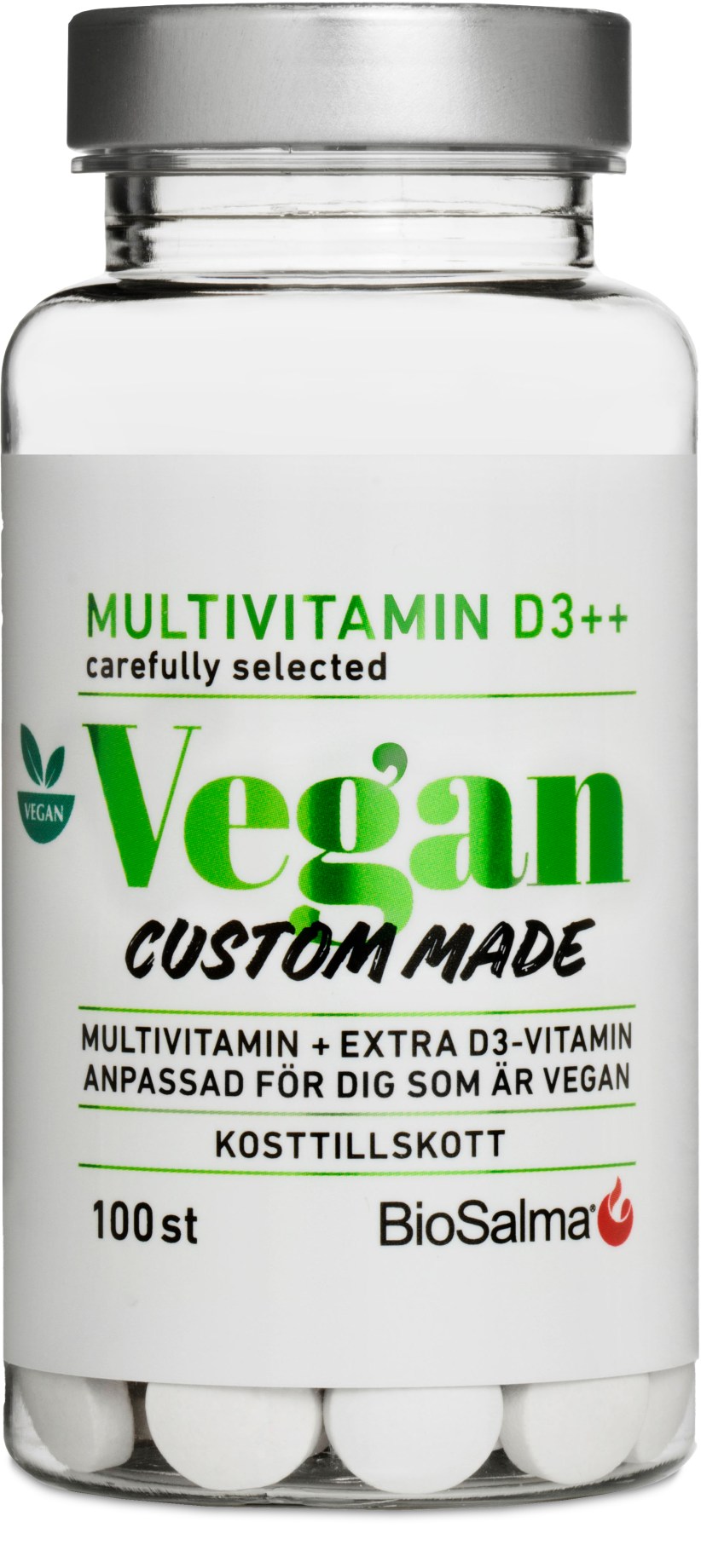 BioSalma Multivitamin Vegan D3-vitamin ++ innehåller särskilt utvalda vitaminer och mineraler för personer som äter en vegansk kost. Extra D-vitamin är tillsatt för att säkerställa intaget. D-vitamin bidrar till att upprätthålla immunsystemets normala funktion och till att upprätthålla normal benstomme.