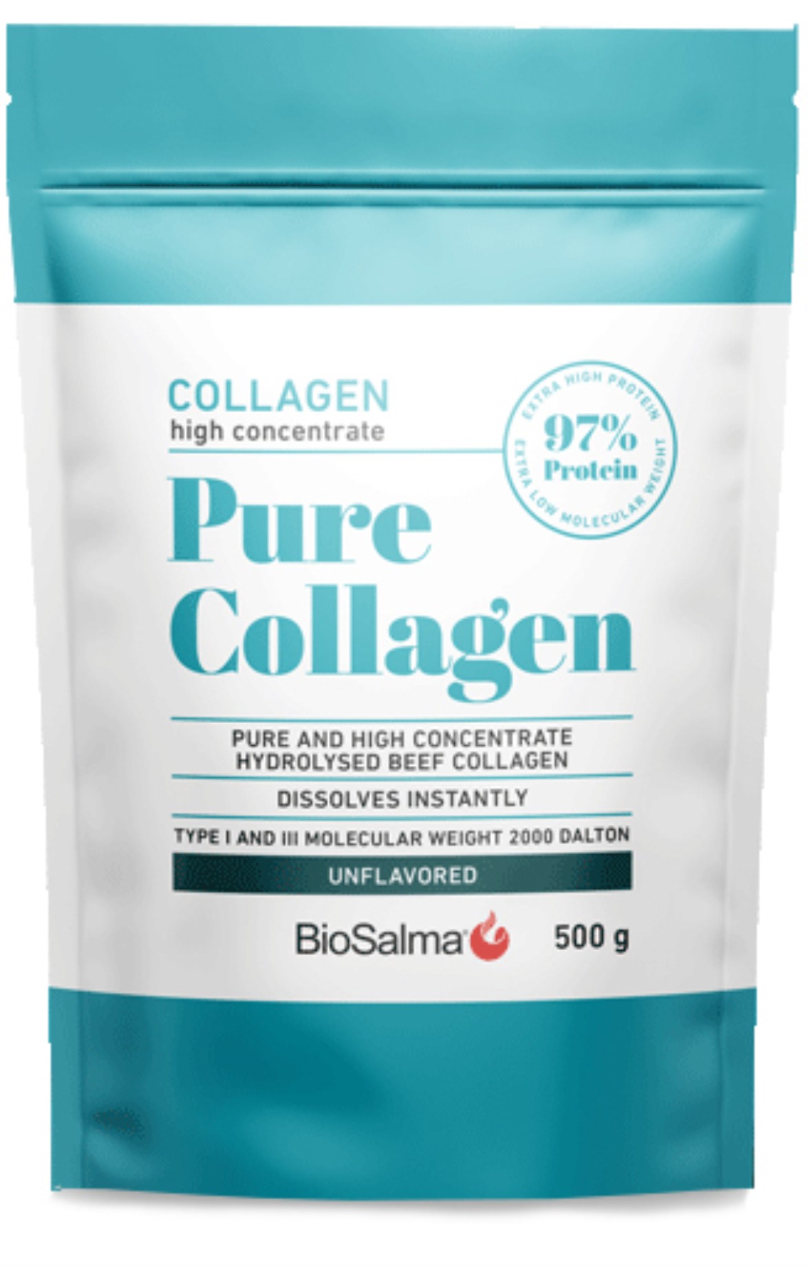 BioSalma Pure Collagen 100% är tillverkat genom enzymatisk hydrolys. Den här metoden producerar små kollagenpeptider (mindre än 2000 dalton). Koncentrationen av protein i BioSalma Pure Collagen 100% är hela 91 % och består av 85 % typ I kollagen och 15 % typ III kollagen. Smaken är neutral och det löser sig snabbt i både kalla och varma vätskor.