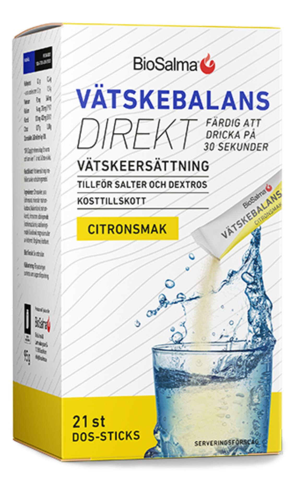 BioSalma® Vätskebalans Direkt är en vätskeersättning som ger dig vätska och salter, förpackade i smidiga dos-sticks. Pulvret löser sig snabbt i vatten – på cirka 30 sekunder – vilket gör att du snabbt kan få i dig vätskeersättningen när du behöver. Finns i smak av hallon och citron.