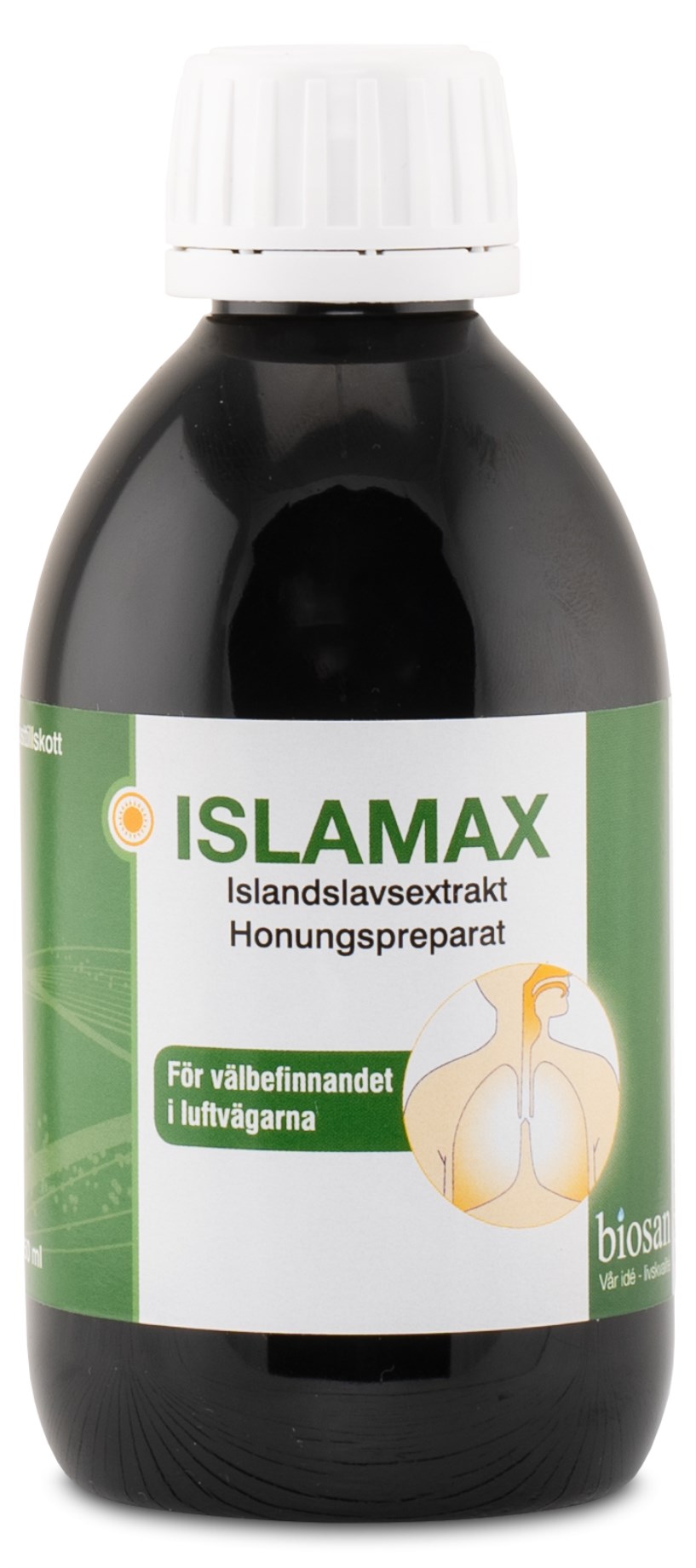 Biosan Islamax är ett välsmakande och naturligt honungspreparat som innehåller extrakt av islandslav, åkerfräken, timjan och anisfrö. Dessa ingredienser har traditionellt använts i syfte att verka slemlösande. Biosan Islamax innehåller organiska föreningar, enzymer, mineraler och vitaminer.