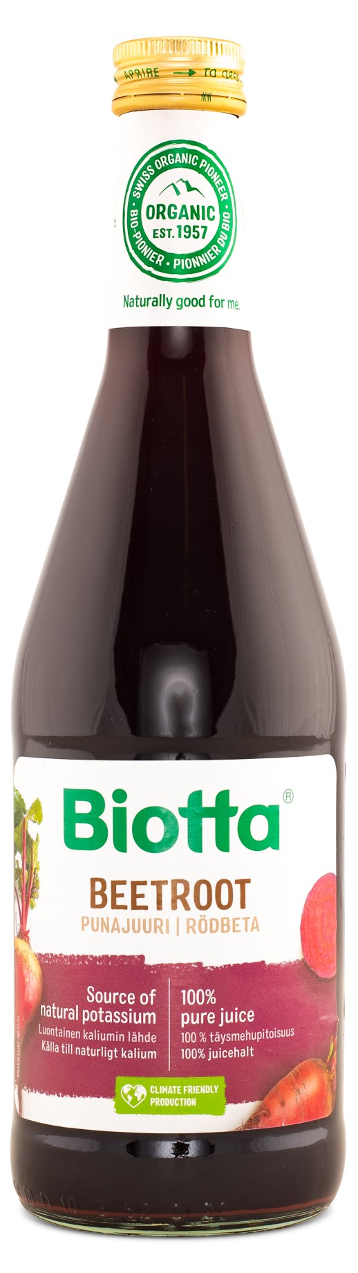 Rödbetsjuice är inte bara gott, det är även fullt av nyttigheter! Rödbetan är rik på antioxidanter och har ett högt innehåll av vitamin B9, folsyra. Dessutom har rödbetan en ovanligt hög halt av nitrater, med flera gynnsamma egenskaper. Nitrat bidrar nämligen till kroppens produktion av kväveoxid, ett ämne som i sin tur hjälper till att vidga blodkärlen och öka blodgenomströmningen. Det i sin tur bidrar till att hålla blodtrycket på en normal nivå.