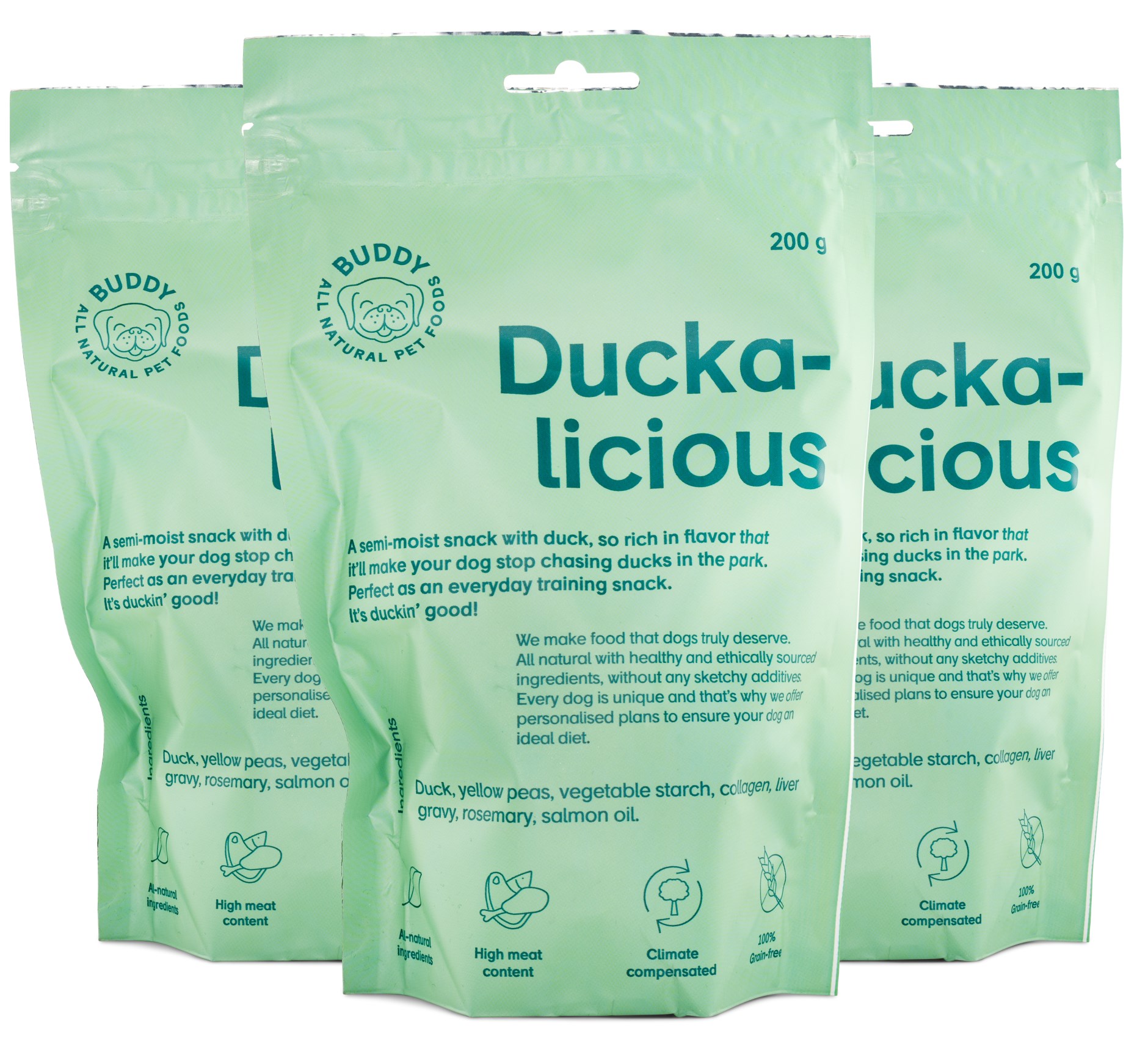 Buddy Duckalicious är ett mjukt hundgodis gjort på 100 % naturliga ingredienser. Rik smak av anka och rosmarin. Godiset är rikt på både protein och omega-fetter. Fritt från tillsatser och spannmål. Ett utmärkt belöningsgodis som passar alla hundar och valpar! Det går enkelt att bryta i mindre bitar.