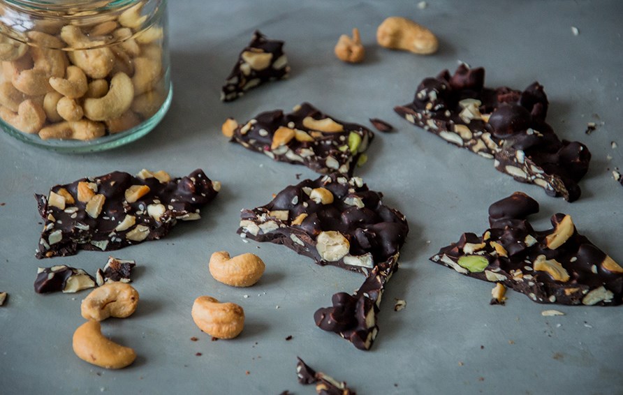Gör såhär: Smält chokladen över ett vattenbad. Hacka nötterna fint och blanda ner i den smälta chokladen. Häll blandningen på en skärbräda, i en form eller på ett bakplåtspapper och ställ in i kylen för att stelna. Låt gärna stå över natten. Skär chokladen i mindre bitar och förvara i kylen tills det är dags att servera.