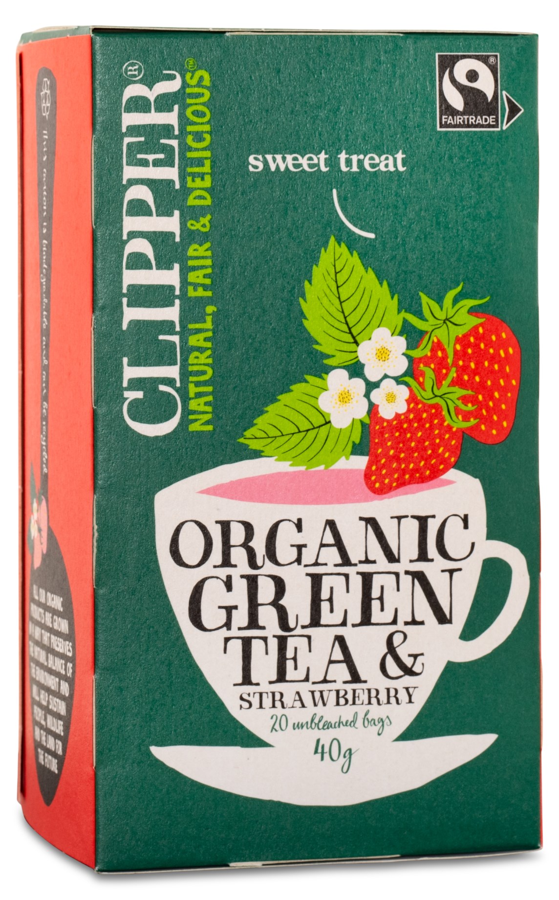 Clipper Tea Green Tea & Strawberry är ett uppfriskande grönt te med smak av jordgubb. Det ljusa teet har tillsatta bitar av jordgubb för en naturlig och god smak. Grönt te har antioxidativa egenskaper och främjar även matsmältningen. Avnjut en kopp ekologiskt och Fairtrade-märkt Clipper Tea Green Tea & Strawberry under dagen eller när du är sugen på något varmt och naturligt sött.