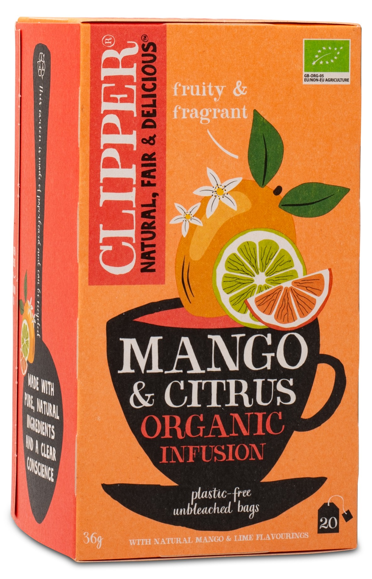 Clipper Tea Mango & Citrus Infusion är ett utsökt och uppfriskande te. En harmonisk kombination av mangons sötma och citrusens friska syra ger en smak som för tankarna till sommaren. Perfekt för att njuta när som helst på dagen. Detta te är naturligt fritt från koffein.