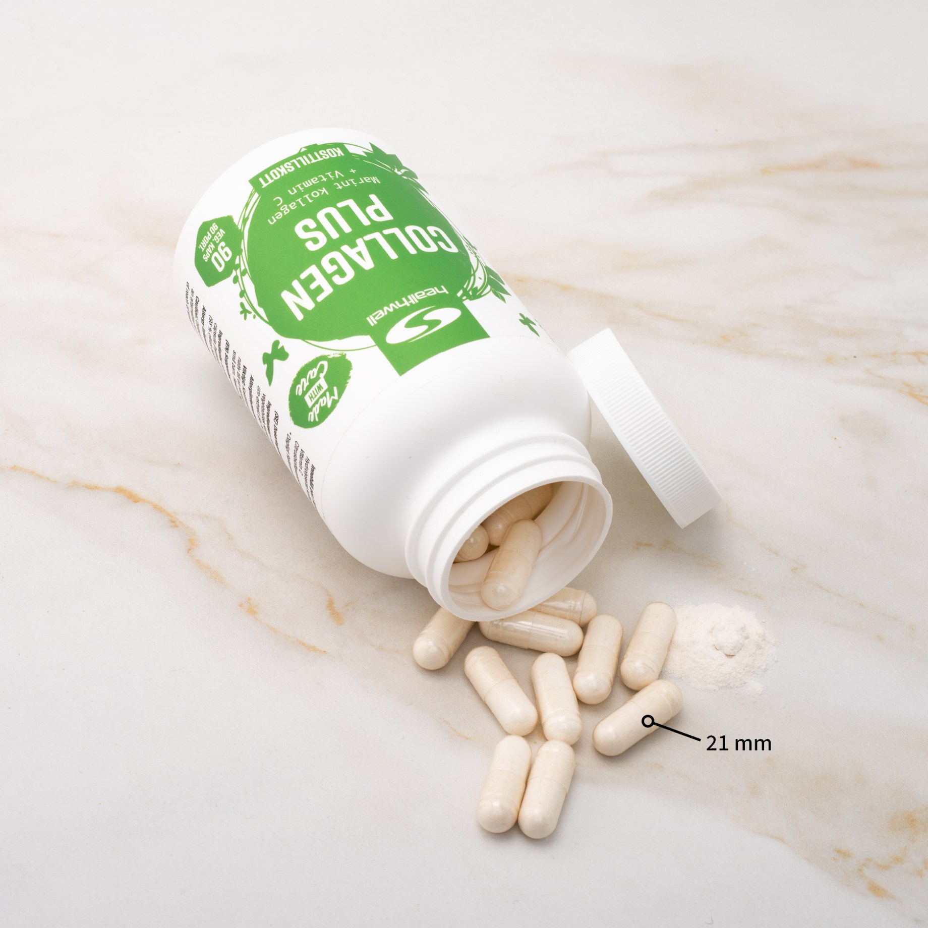 Collagen Plus från Healthwell innehåller hydrolyserat kollagen från marint ursprung. Fiskkollagen är en bra källa till kollagen, och särskilt kollagen typ I. En annan fördel med kollagen från fisk är att det är lätt för kroppen att ta upp. Dessutom fungerar Collagen Plus även för personer som utesluter kött ur sin kost, tack vare att det istället kommer från fisk. Kött är annars den vanligaste källan till kollagen i kosttillskott. Collagen Plus innehåller kollagen med molekylvikt 2000 dalton, vilket är ett mått på att molekylen är tillräckligt liten för att kunna tas upp bra av kroppen.