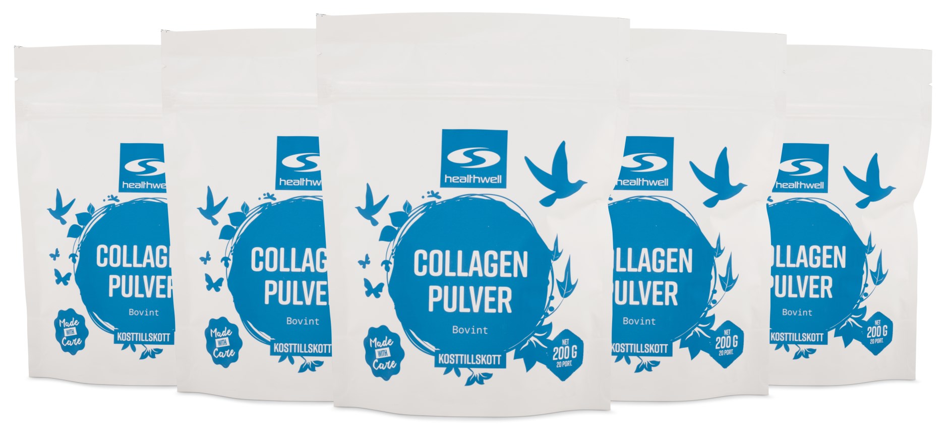 Healthwell Collagen Pulver Bovint innehåller kollagenpeptider typ I, den kollagentyp som är vanligast förekommande i människokroppen. Kollagen produceras naturligt av kroppen och du tillför viss mängd via maten du äter. Dock avtar produktionen mer och mer efter 30-årsåldern, vilket bland annat medför att kollagenet inte längre bidrar till samma återfuktning av huden och smörjning av lederna. Torrare hud kan göra fina linjer och ojämnheter tydligare, medan mindre kollagen i lederna kan bidra till känslan av stelhet. Ett tillskott av kollagen kan därför vara aktuellt för att stötta upp kollagenets verkan på både insidan och utsidan.