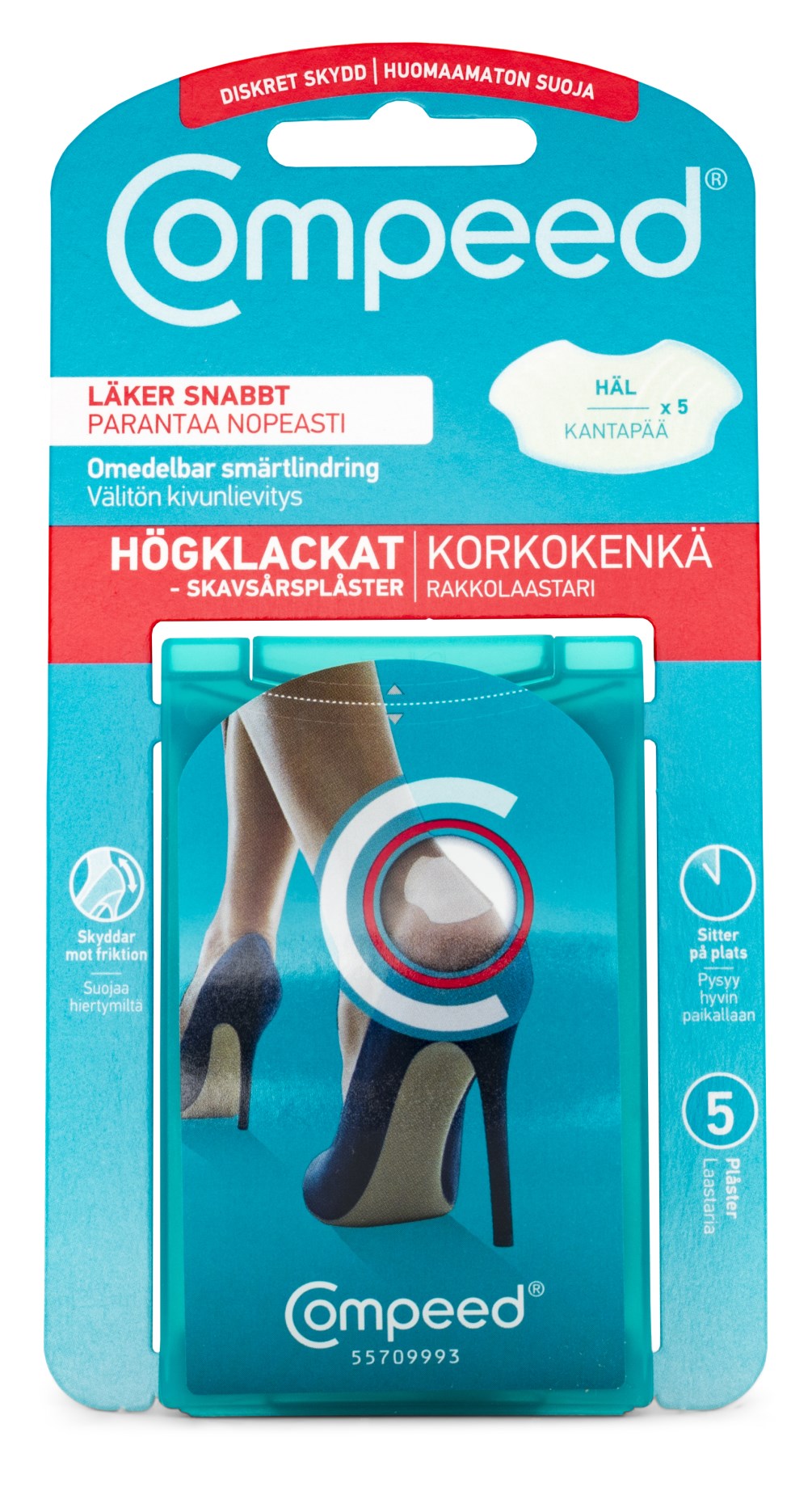 Compeed Plåster High Heel är ett skavsårsplåster med hydrokolloidteknologi som består av en aktiv gel med fuktabsorberande partiklar som stöder den naturliga fuktbalansen. Plåstret fungerar som ett extra hudlager, det ger en skön tryckavlastning och ger omedelbar smärtlindring. Plåstrets fjärilsformade design med genomskinliga kanter ger en ultimat diskretion. Passande för skavsår orsakade av högklackade skor.