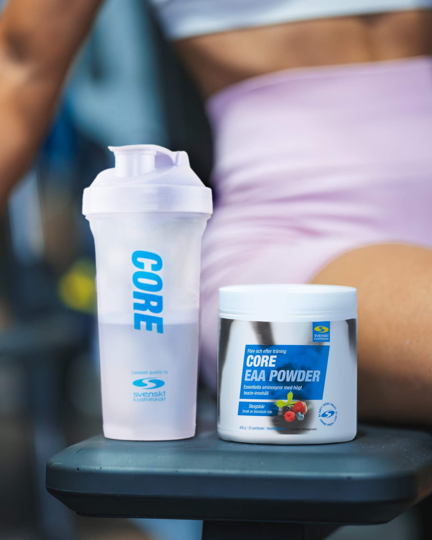 Kvinna på träningsbänk med shaker i handen och Core EAA-burk framför sig.Aminosyror i samband med träning hjälper dig med dina resultat.
