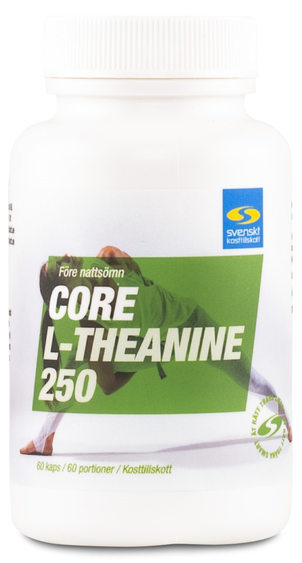 L-teanin är en icke-essentiell aminosyra som finns naturligt i tebuskens blad. I en vanlig kopp te, cirka 2 dl, finns vanligtvis mellan 20-60 mg teanin. Core L-theanine 250 är ett mycket koncentrerat tillskott som innehåller 250 mg L-teanin per dos. L-teanin är inte en aminosyra som används för att bygga proteiner utan har istället andra funktioner i kroppen. Det tas oftast innan sänggående för att främja en känsla av lugn och avslappning. "L" i L-teanin indikerar att det finns i form av L-isomer.