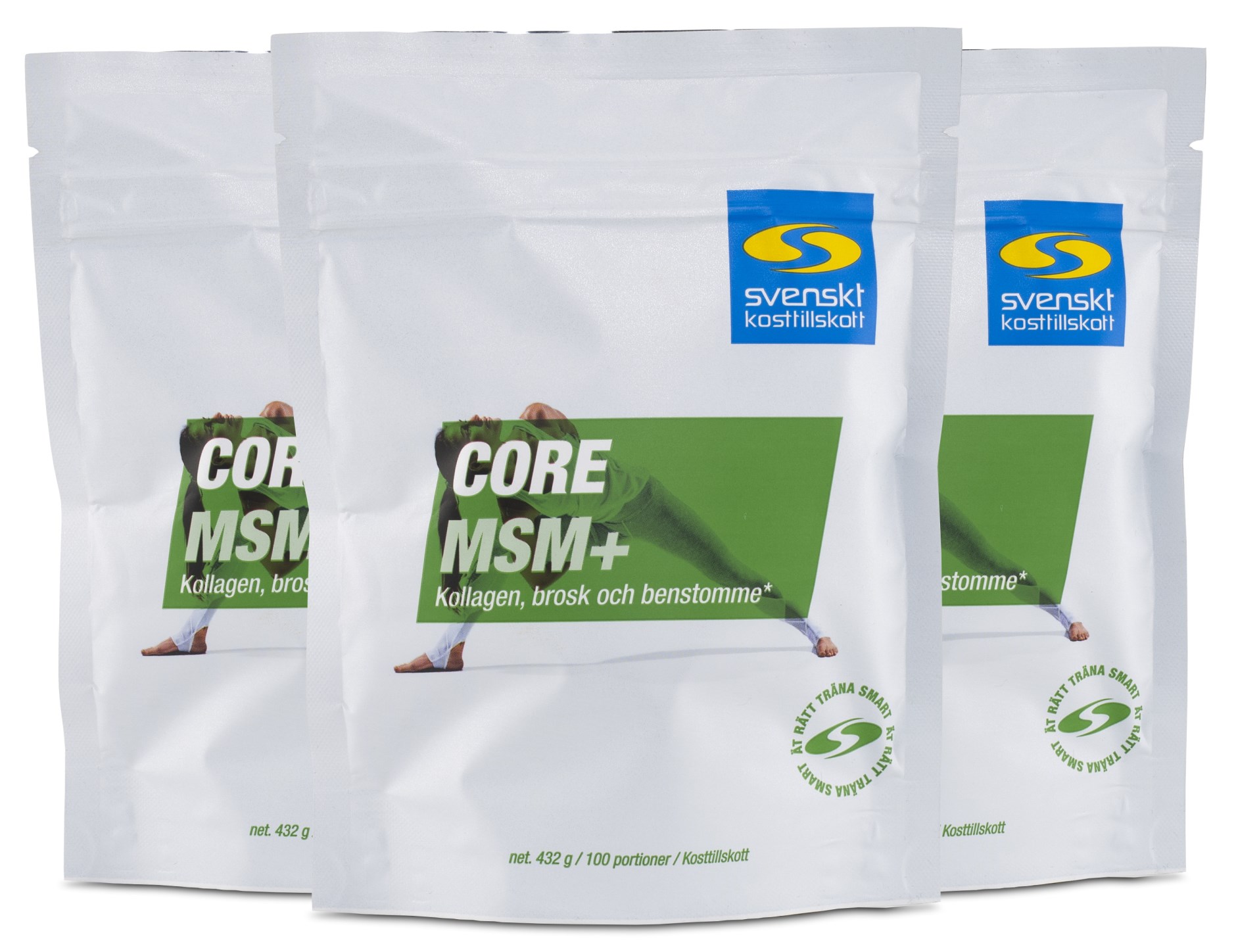 Core MSM+ är ett kosttillskott för dig som är aktiv och tycker om att röra på dig. MSM är organiskt svavel som vi har naturligt i kroppen, ungefär 0,25 % av kroppsvikten är svavel. Svavel är en viktig beståndsdel för kollagen och keratin som i sin tur hjälper till att bygga upp leder, brosk, muskler, hud och hår. Tidigare har MSM ofta uppmärksammats som ett skönhetsmineral tack vare dess effekt på hud och hår. På senare tid har det även börjat bli ett allt mer populärt träningstillskott. Core MSM+ innehåller även vitamin C som också den är viktig för kollagenbildningen. Vitaminet hjälper även till med att maskera smaken på MSM, pulvret har nämligen en svagt besk smak som dock lätt kan döljas av syrliga drycker. Vitamin C bidrar även till att optimera upptaget av MSM.