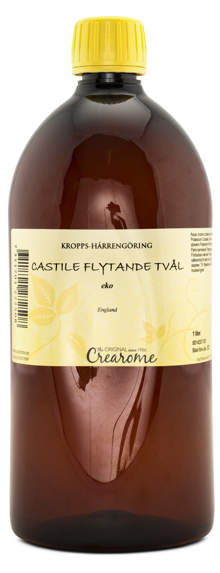 Crearome Castile Flytande Tvål Eko är en färdig bastvål som kan användas till både handtvål och kroppstvål. Du kan göra konsistensen mer trögflytande genom att tillsätta salt och tillföra både härliga dofter och välgörande egenskaper med hjälp av eteriska oljor. För en lugn och harmonisk känsla kan du tillsätta lavendelolja, och vill du ha en riktigt fräsch duschtvål passar citronolja eller eukalyptusolja bra. Crearome Castile Flytande Tvål Eko tillverkas genom förtvålning av fett och olja och innehåller inte tensider.