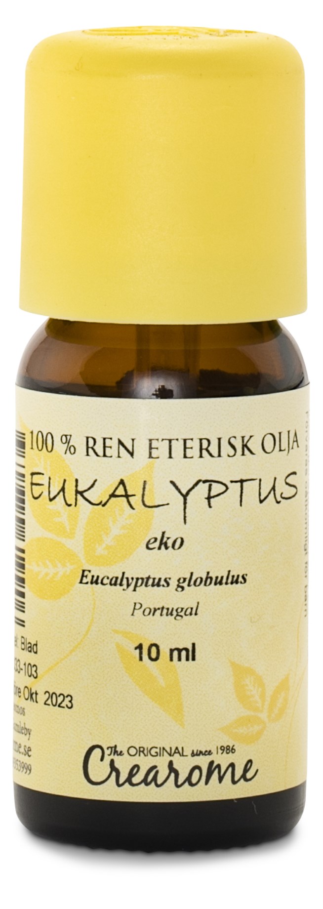 Crearome Eterisk Eukalyptusolja EKO är en äkta eterisk olja med kraftfull doft av eucalyptus. Eterisk eukalyptus används vid aromaterapi i en aromalampa för att sprida en frisk och ren doft i rummet. Eukalyptus kan kännas extra behagligt att andas in vid förkylning eller ont i halsen. Crearome eukalyptus är en ekologisk eterisk olja från eukalyptusträdets blad. Prova även att droppa lite eukalyptusolja i en massageolja för massage, eller använd som smaksättare vid bakning. Observera att du alltid behöver späda eterisk olja och inte använda direkt på huden eller som förtäring.
